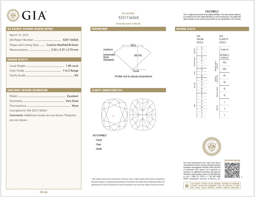 A loose cushion cut Diamond of 1.00ct (with GIA report graded as Y-Z SI2 #5201136565). (New)
