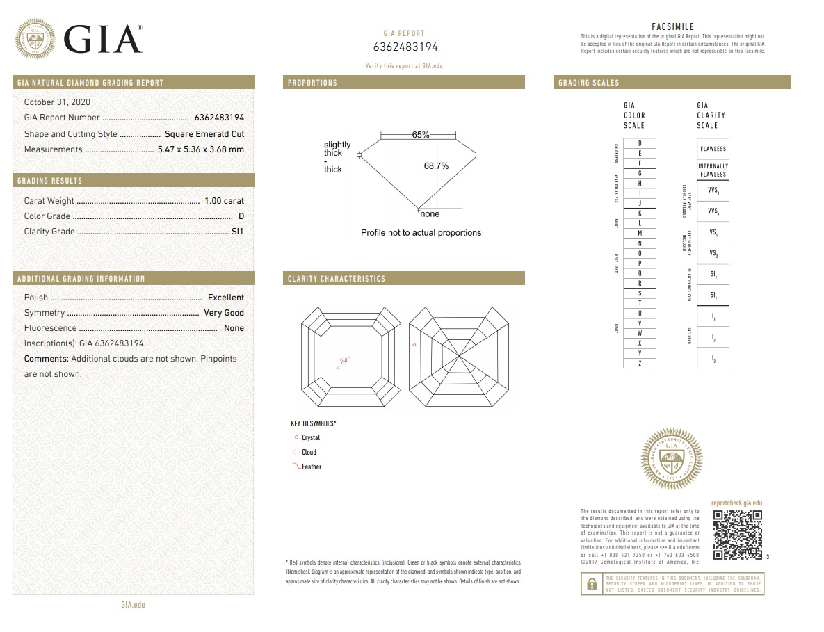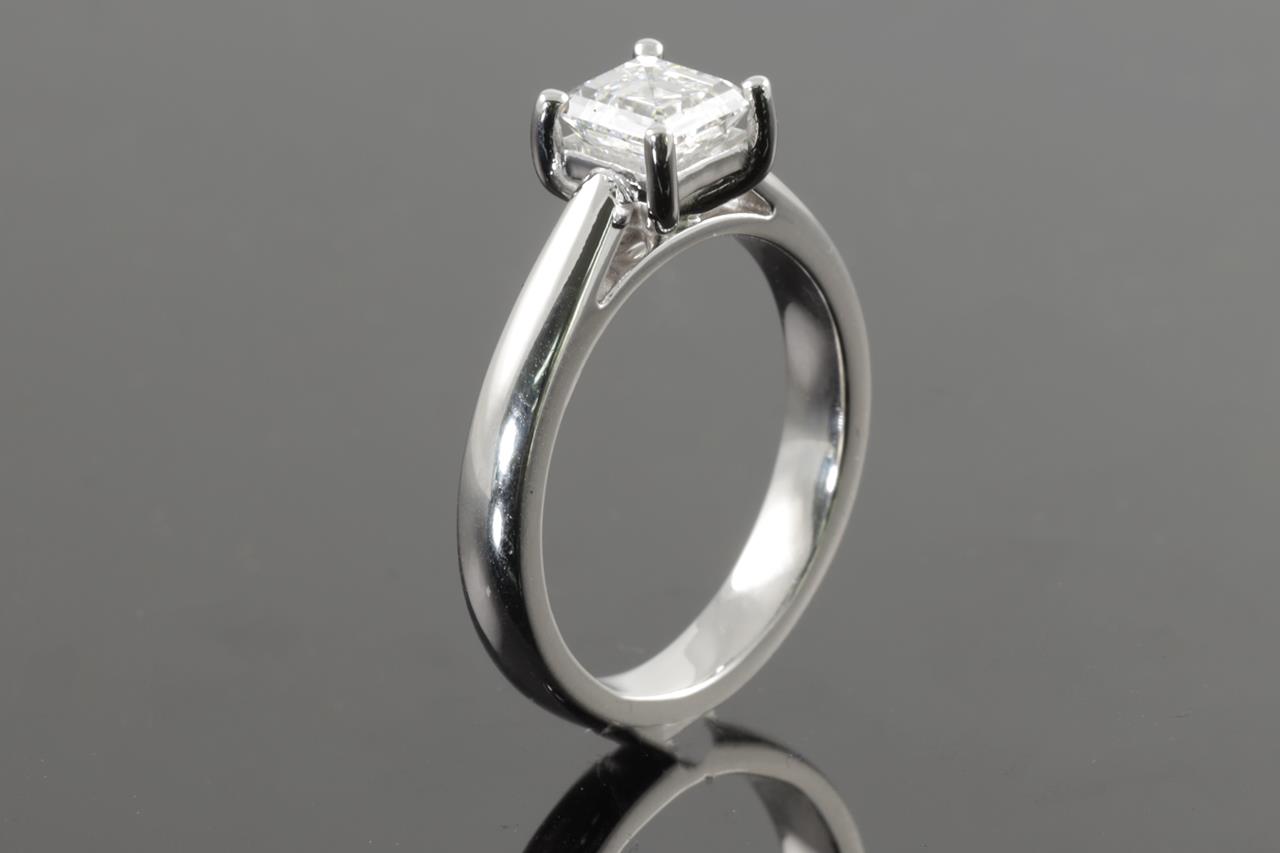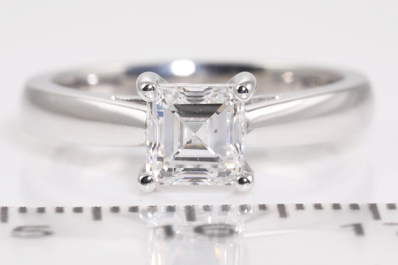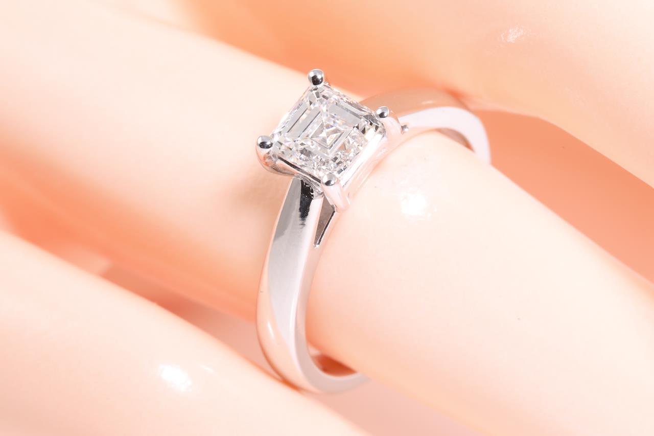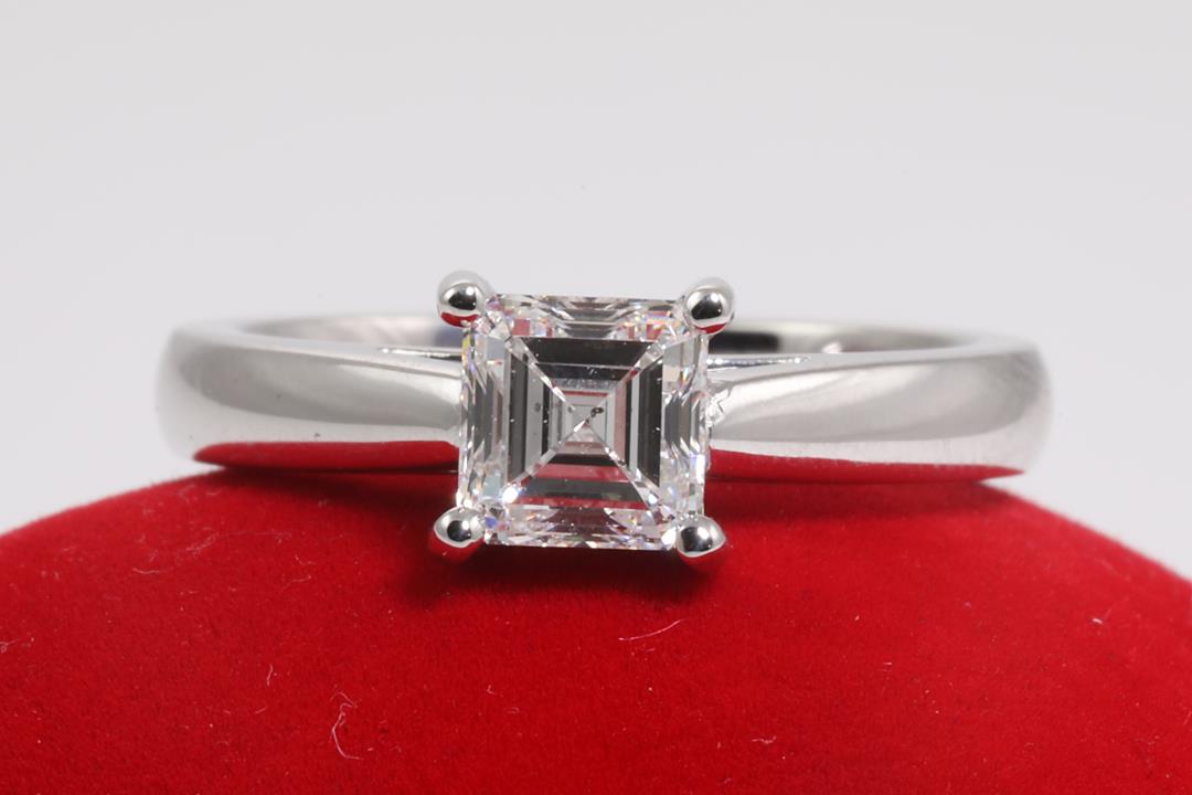 Diamond solitaire ring with square emerald cut Diamond of 1.00ct (With GIA report graded as D SI1 #6362483194). 18ct white gold. Ring size L. Weight: 5.9g (New)