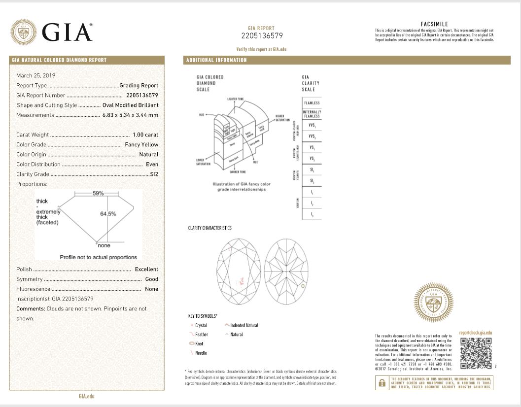 A loose oval shape Diamond of 1.00ct (with GIA repot graded as Natural Fancy Yellow Even SI2 #2205136579). (New)