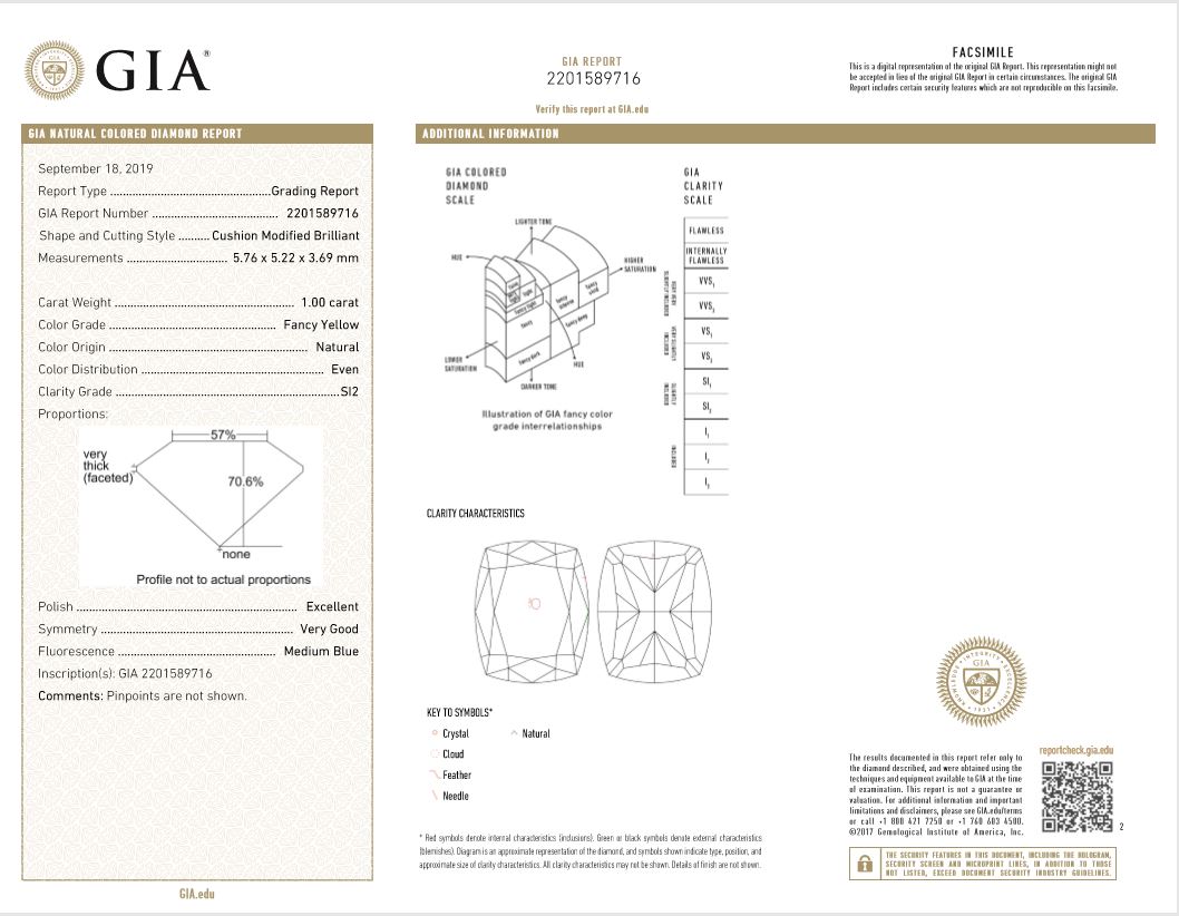 A loose cushion cut Diamond of 1.00ct (with GIA report graded as Natural Fancy Yellow Even SI2 #2201589716). (New)