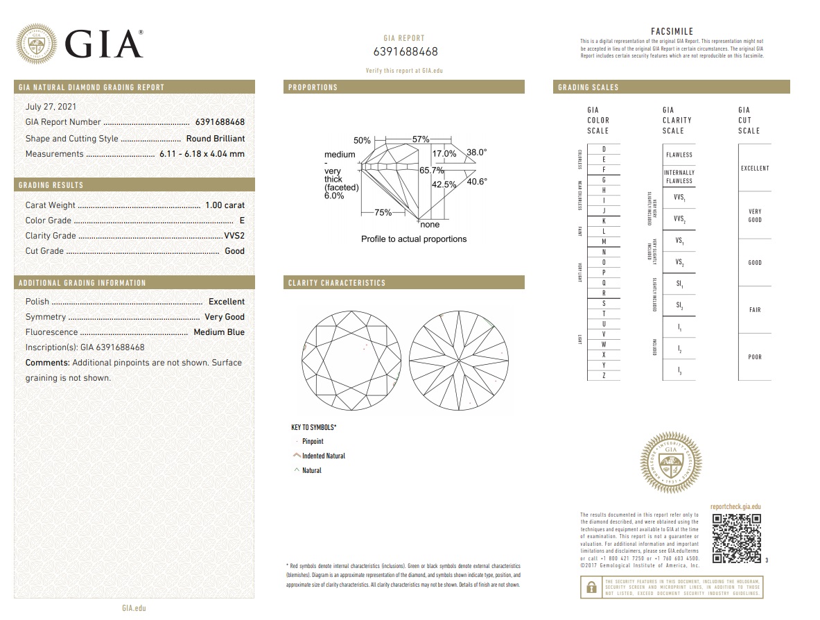 A loose round brilliant cut Diamond of 1.00ct (with GIA report graded as E VVS2 #6391688468). (New)