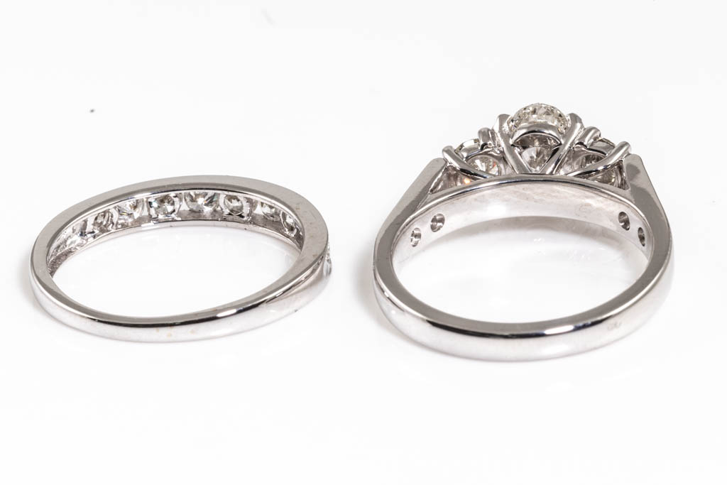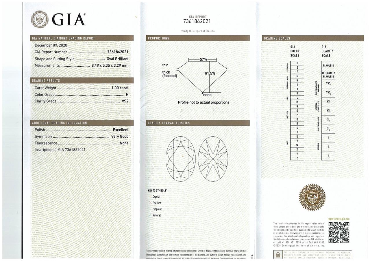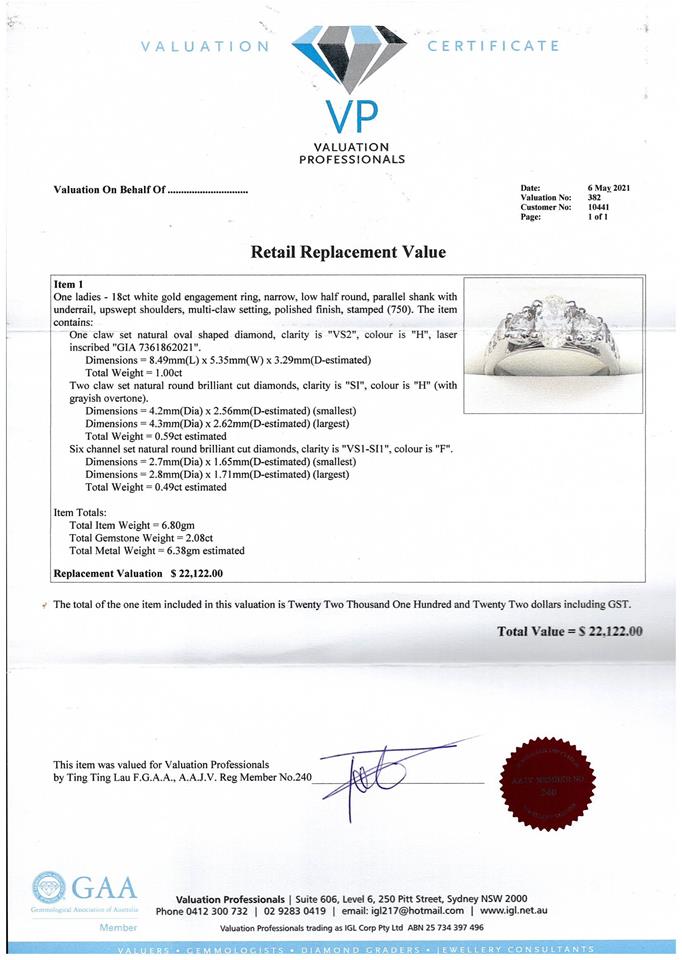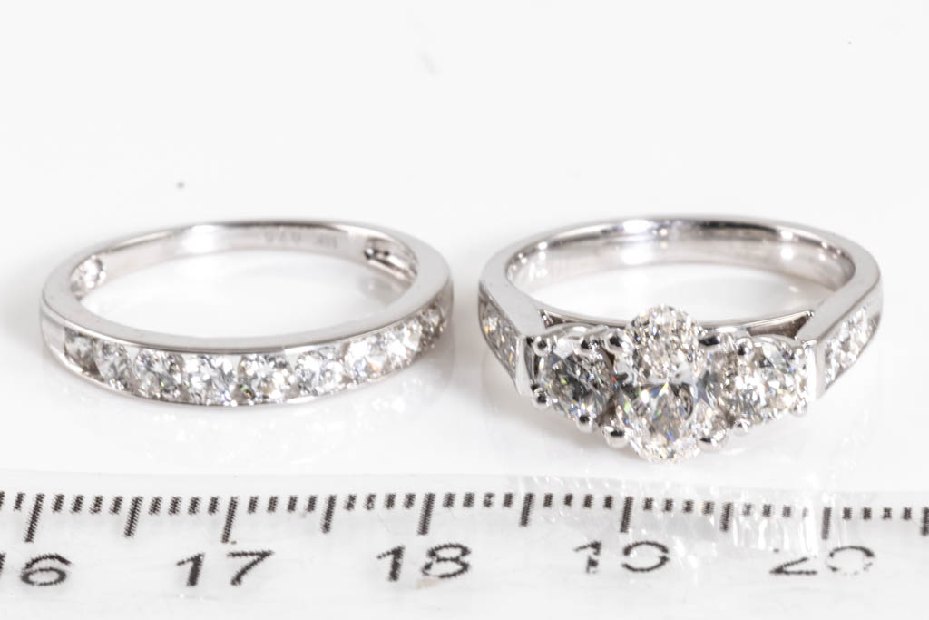 Wedding set with Diamond engagement ring with oval cut centre Diamond of 1.00ct (With GIA report graded as H VS2 #7361862021). And round Diamonds totalling approximately 1.08cts (estimated grading F-H VS-SI). 18ct white gold. With eternity wedding ring with round Diamonds totalling approximately 0.74cts (Estimated grading: H SI). 18ct white gold. Ring size P - resizing not recommended. Weight 8.7g. With Valuations. (Pre-owned)
