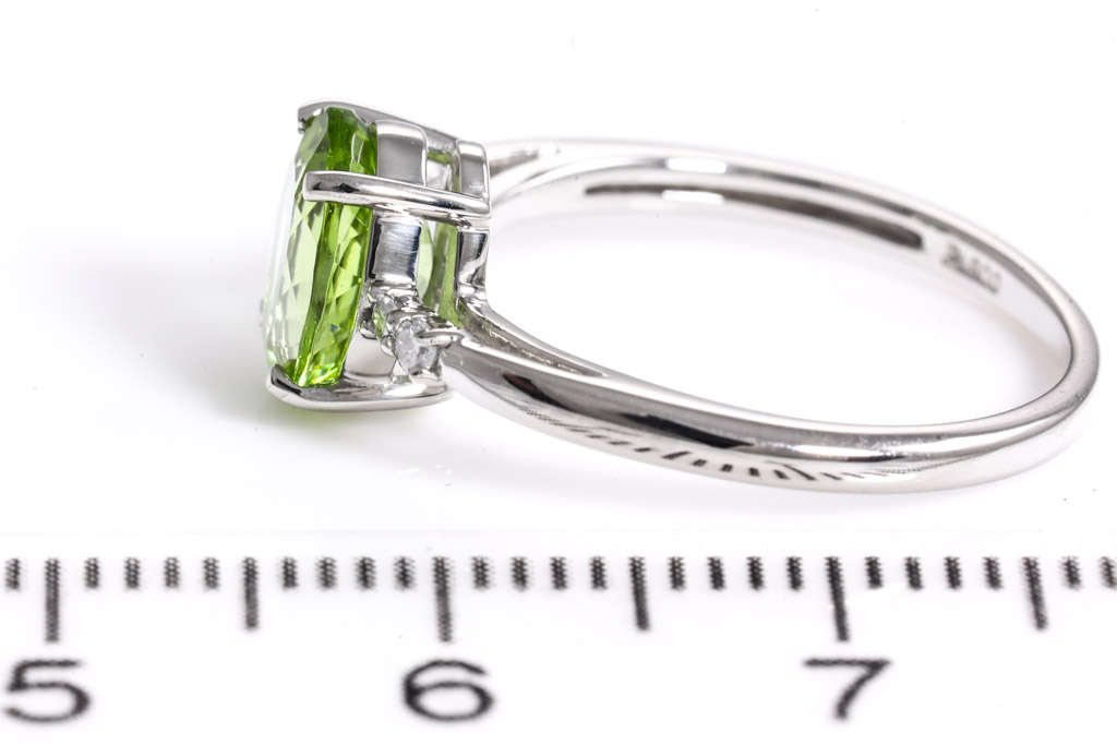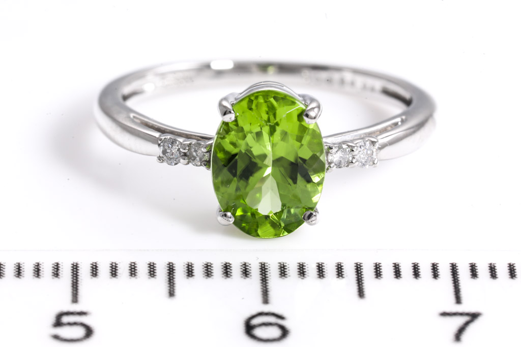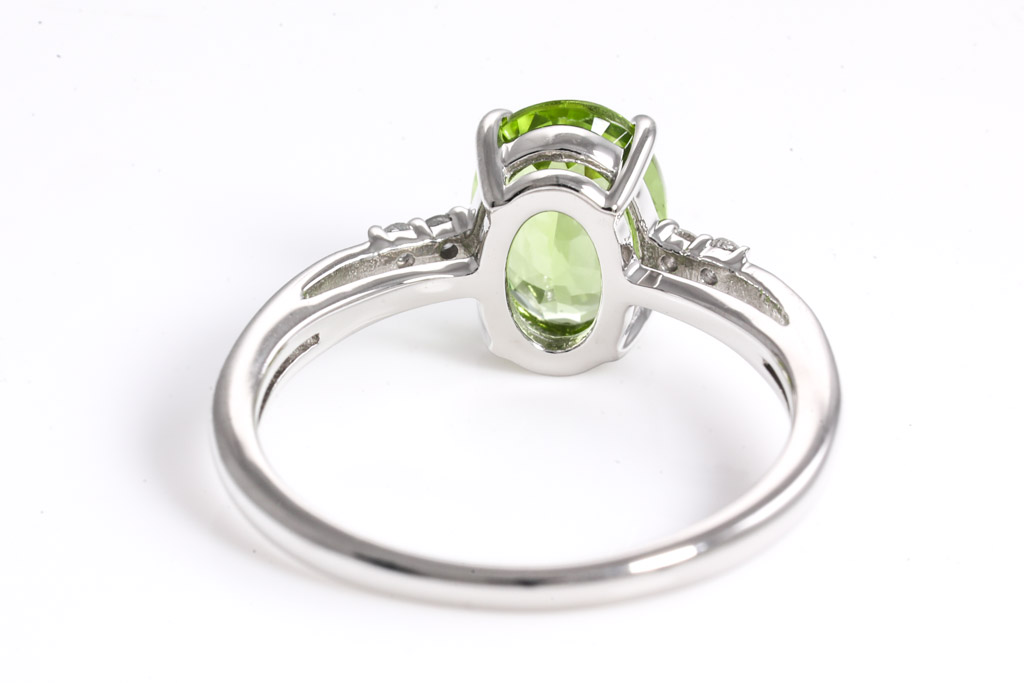 Peridot and Diamond ring with oval shape Peridot of 1.00ct and Diamonds totalling 0.04cts. Platinum. Ring size J1/2 - ring resizing is not recommended. Weight: 3g. (Pre-owned)