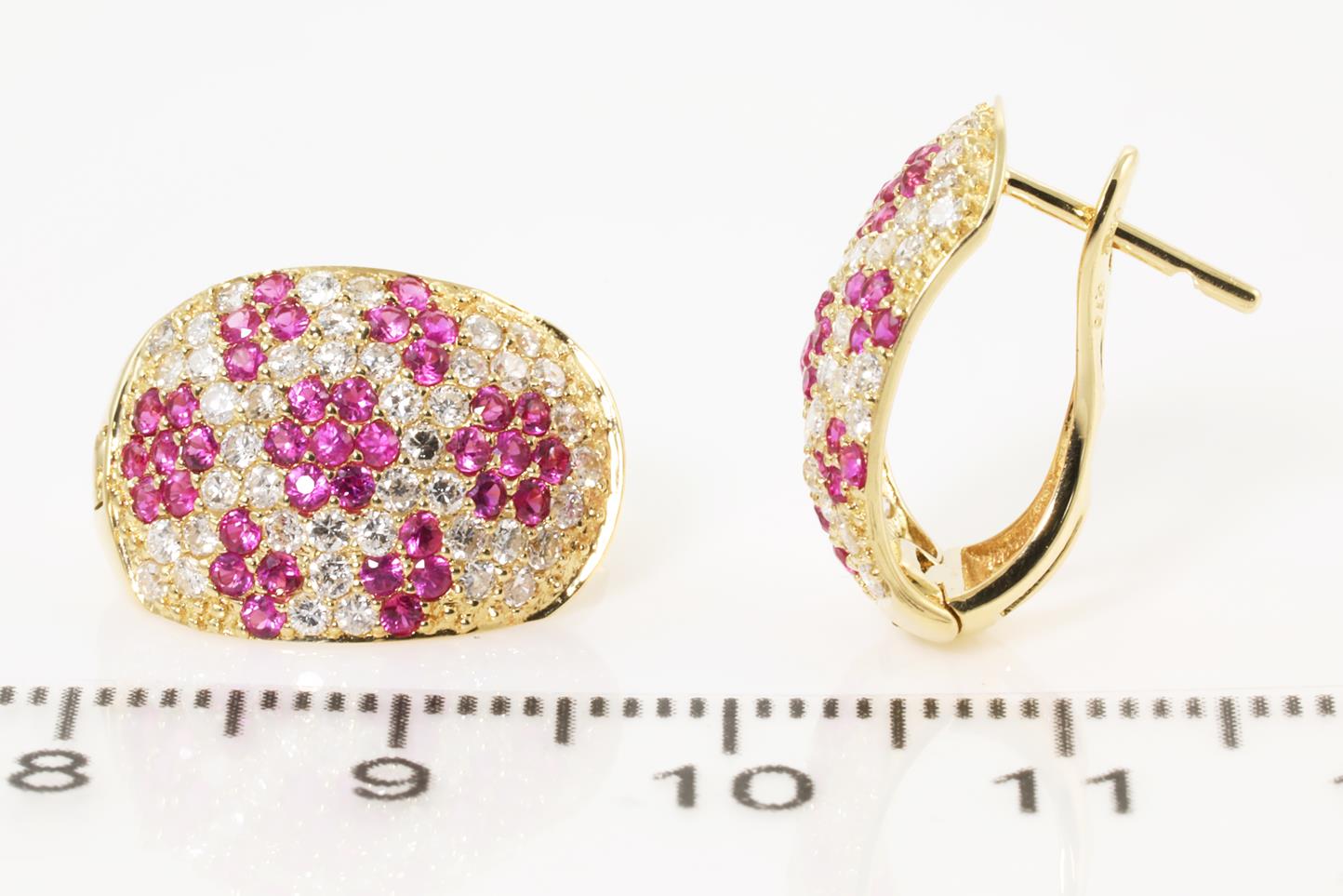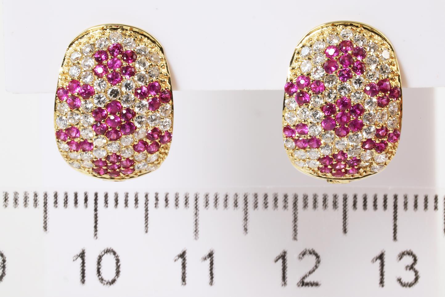 Ruby and Diamond clip-on earrings (for pierced ears) with round Rubies totalling 1.00cts and round Diamonds totalling 1.50cts (Estimated grading: H-J SI). 18ct yellow gold. Weight: 4.2g (Pre-owned)