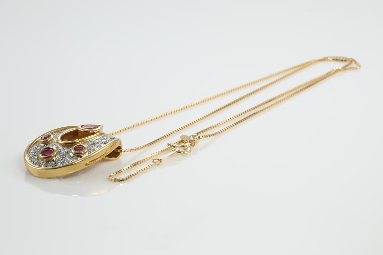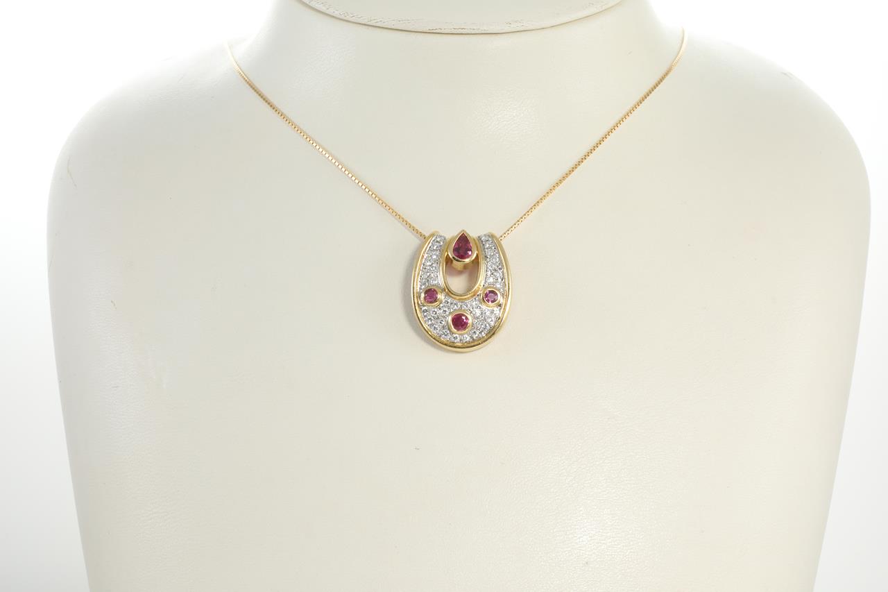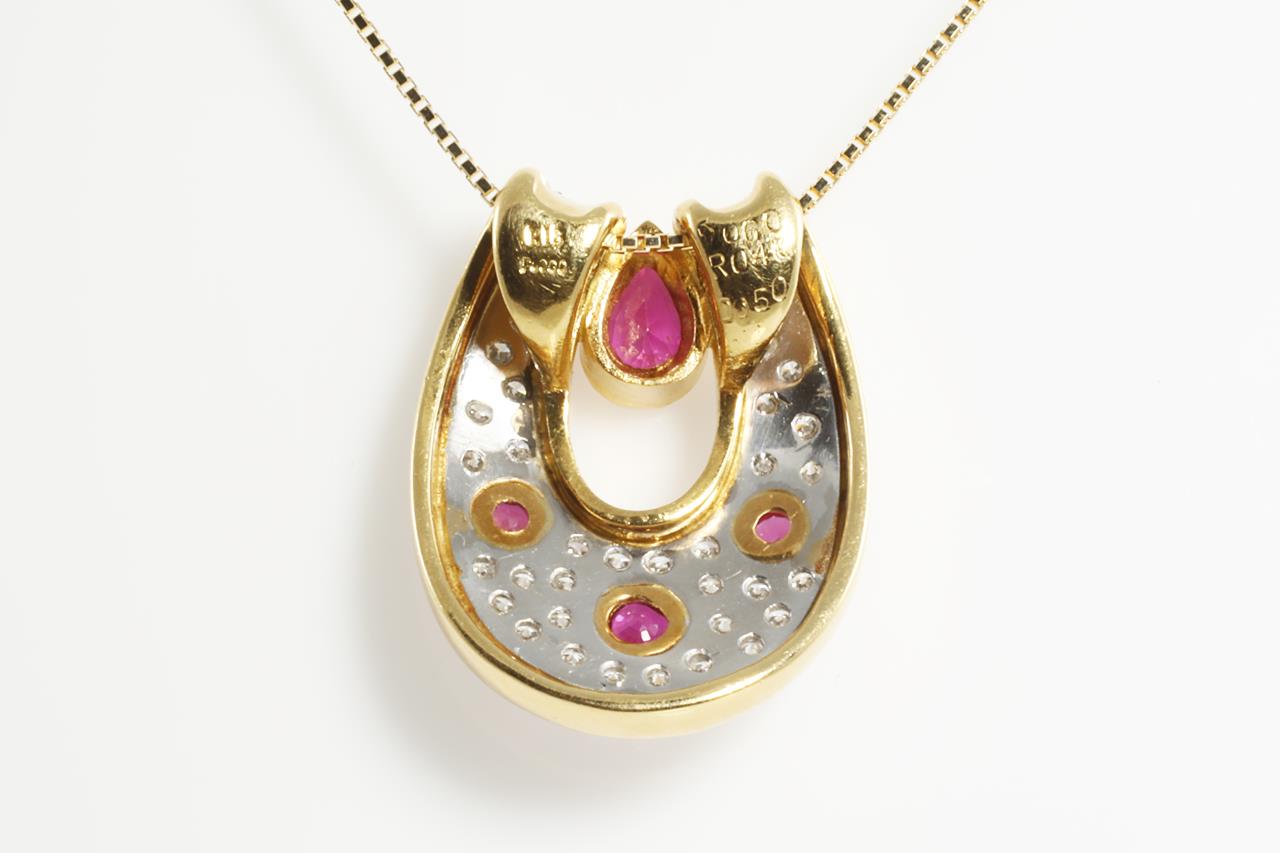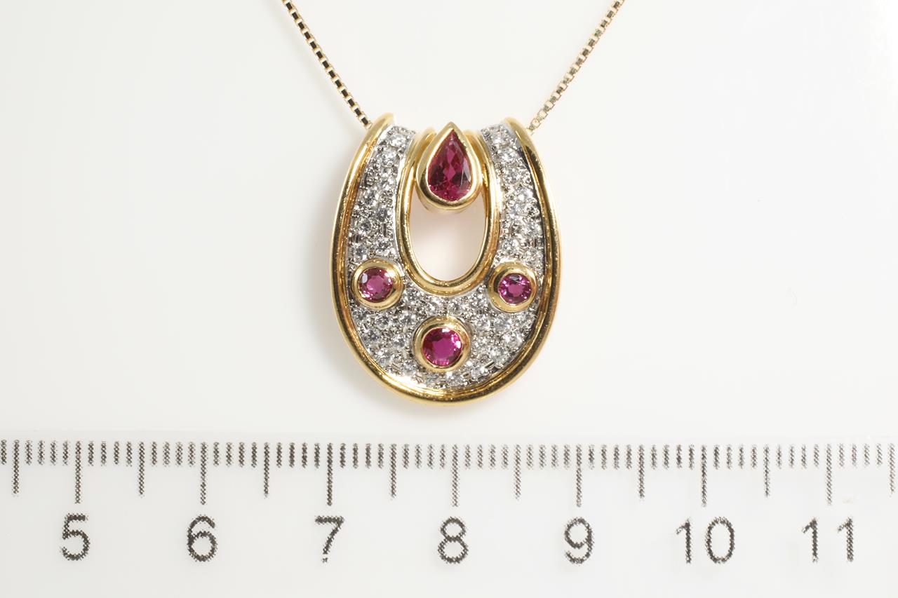 Ruby and Diamond horse-shoe pendant with a pear and round shape Rubies totalling 1.00cts and Diamonds totalling 0.50cts (Estimated Grading: G VS-SI). 18ct yellow gold and platinum with 18ct gold 45cm adjustable chain. Weight: 7.6g (pre-owned)