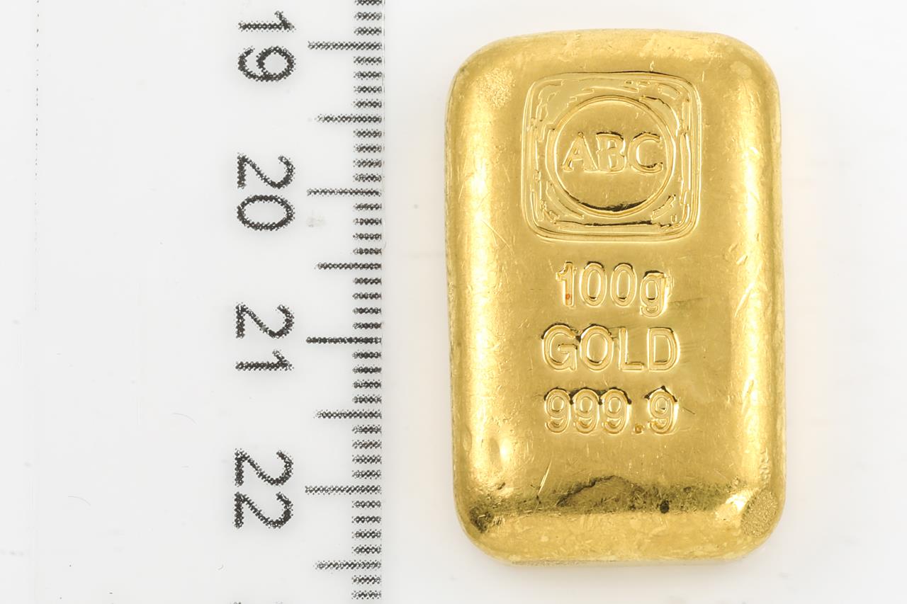 An ABC Bullion Fine Gold Bar. Weight 100g. ***Gold bullion attracts no GST and no Buyers Premium***