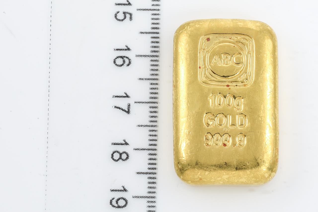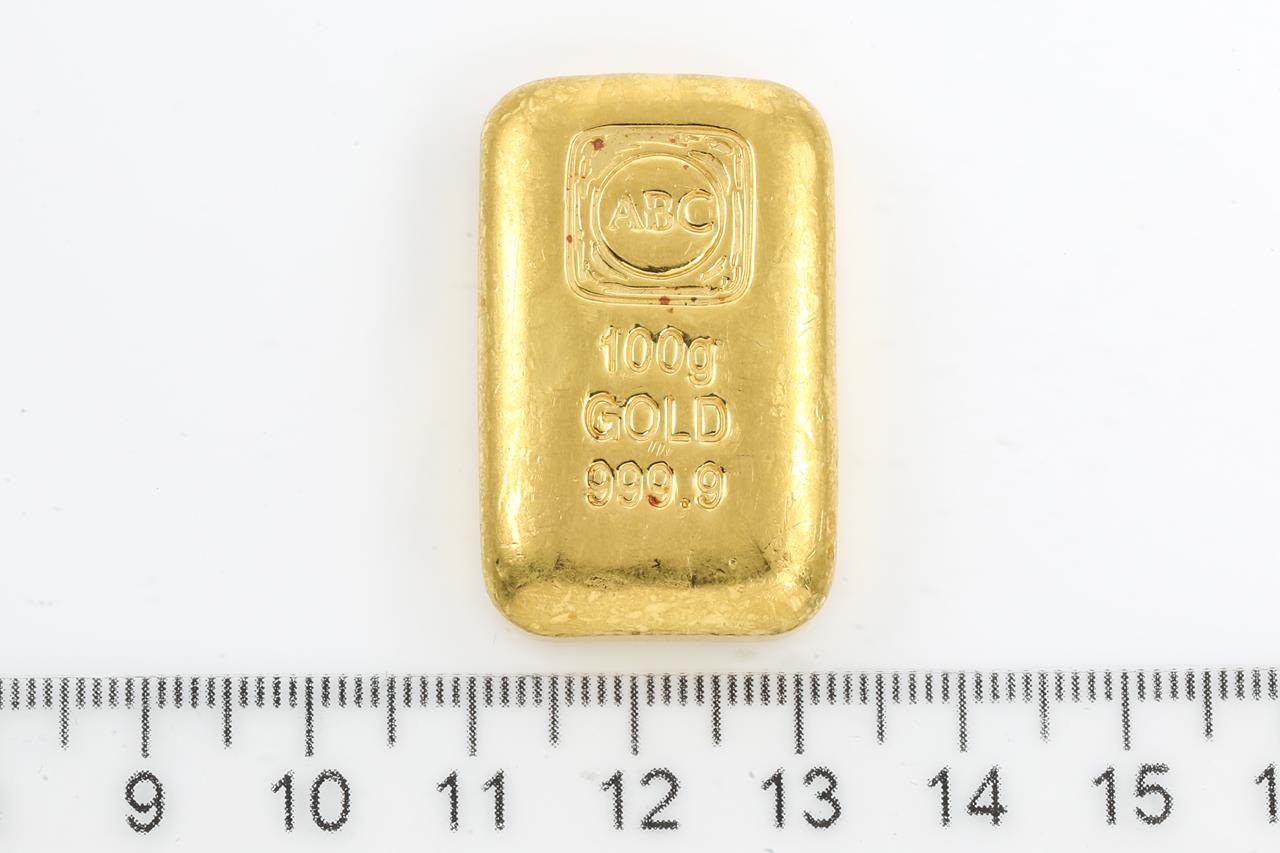 An ABC Bullion Fine Gold Bar. Weight 100g. ***Gold bullion attracts no GST and no Buyers Premium***