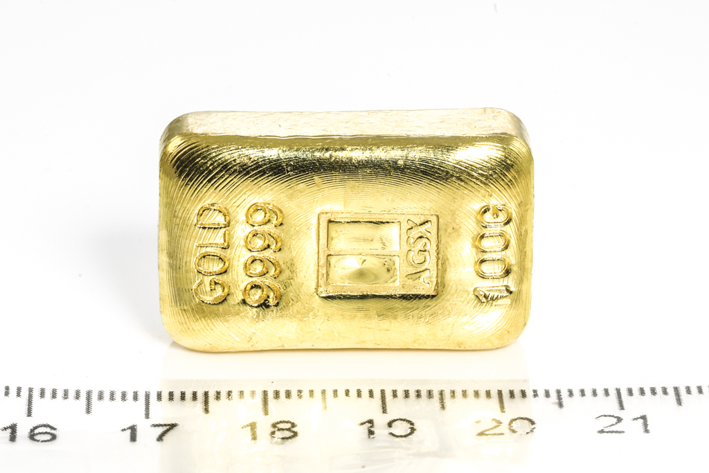 An AGSX Fine Gold Bar. Weight: 100g. ***Gold bullion attracts no GST and no Buyers Premium. Available for shipping within Australia only***