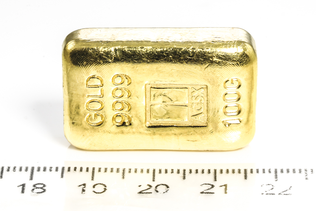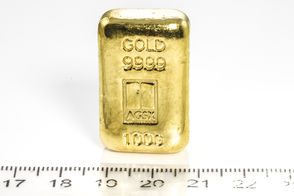 An AGSX Fine Gold Bar. Weight: 100g. ***Gold bullion attracts no GST and no Buyers Premium. Available for shipping within Australia only***