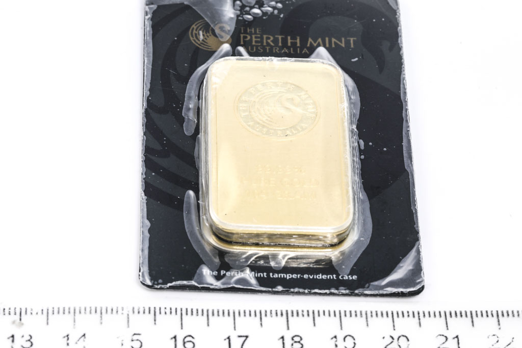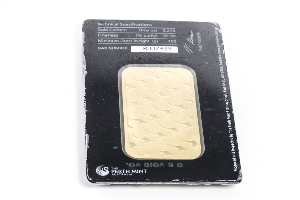 A Perth Moint Fine Gold Bar. Weight: 100g. ***Gold bullion attracts no GST and no Buyers Premium. Available for shipping within Australia only***