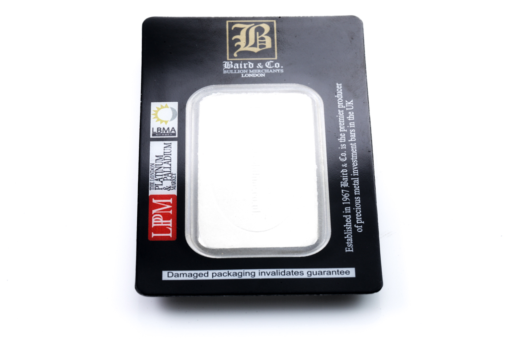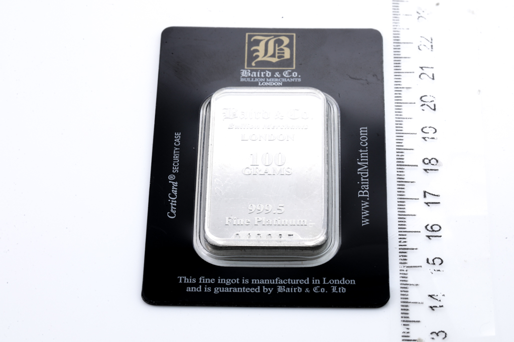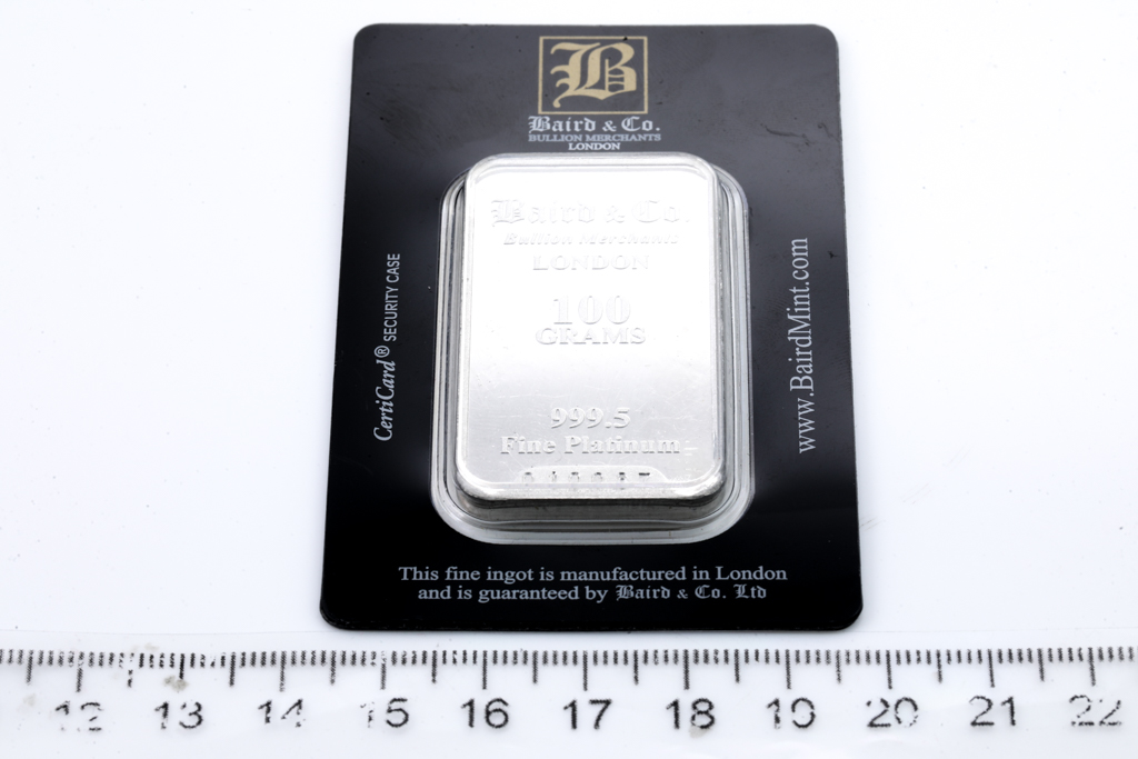 A Baird & Co Fine sealed Platinum Bar. Weight: 100g. Serial number 010087. (Pre-owned) ***Platinum Bullion attracts no GST and no Buyers Premium. Available for shipping within Australia only***
