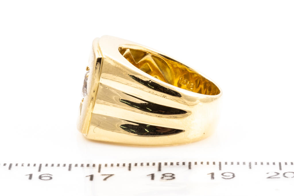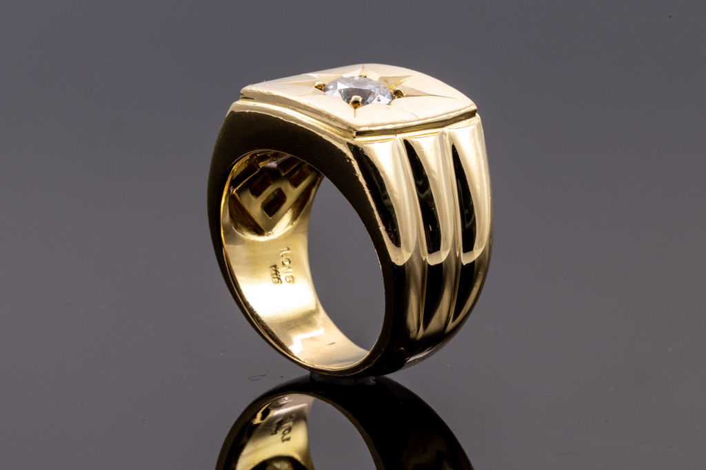 Mens ring with a round Diamond of 1.01ct (Estimated grading: H-I P2). 18ct yellow gold. Ring size Q. Weight: 23.6g. With Certificate #416167. (Pre-owned)