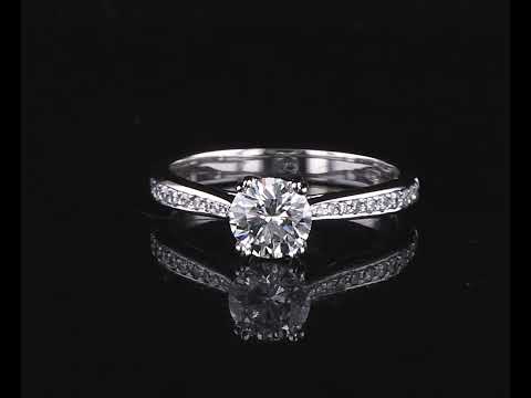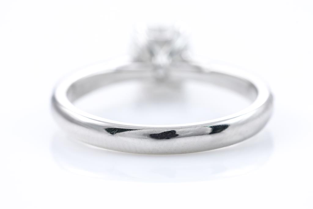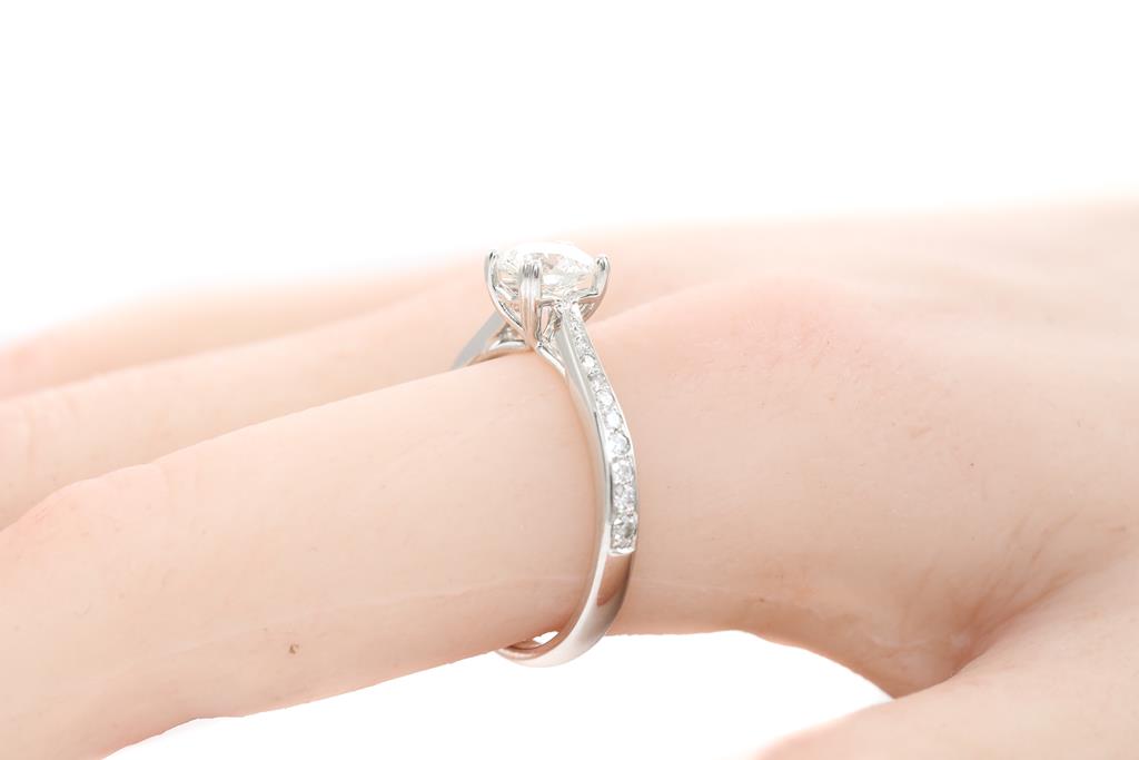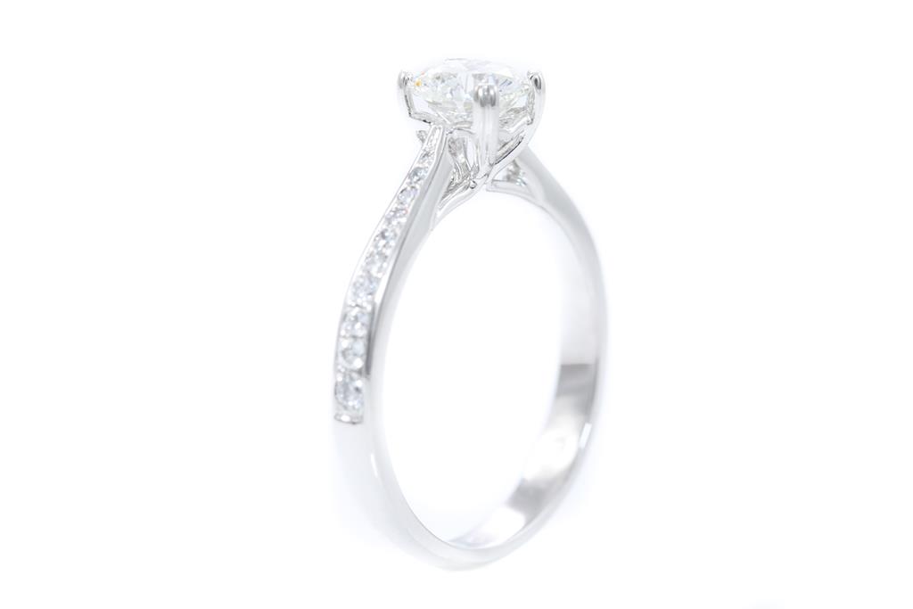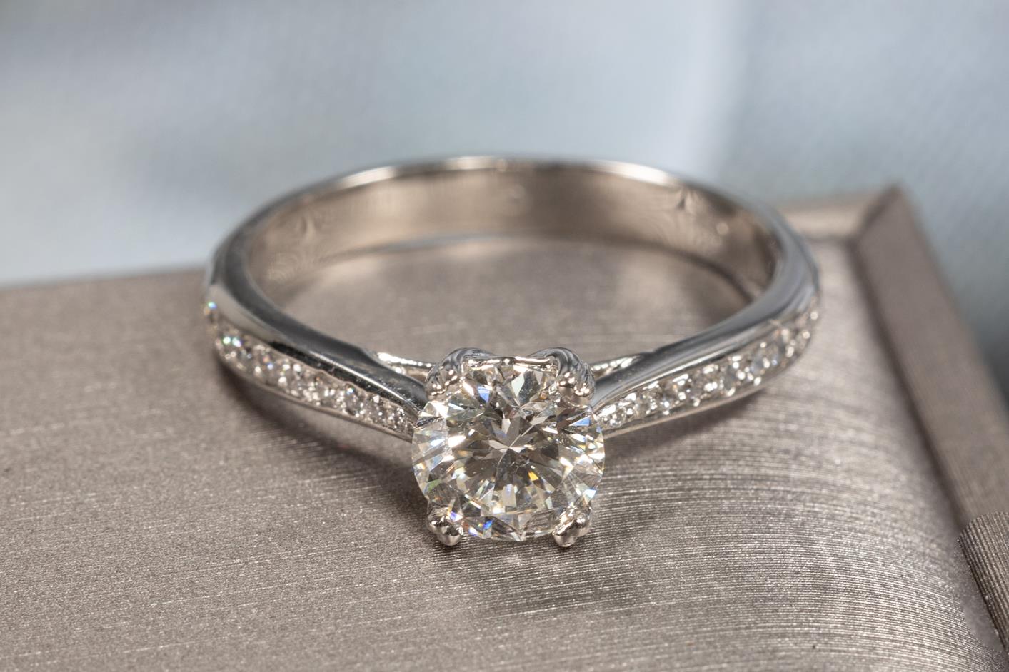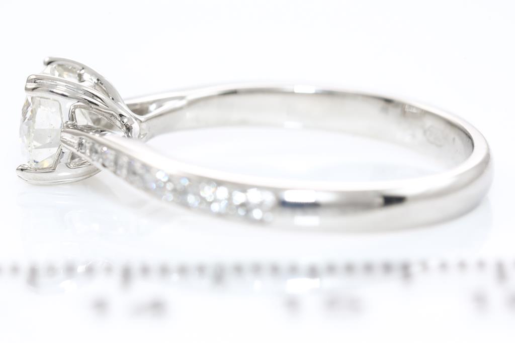 Diamond ring with centre round brilliant cut Diamond of 1.01ct (with GIA report graded H SI1 #6137636686) and round Diamonds on shoulders totalling approximately 0.24cts (Estimated grading H SI2). 18ct white gold. Ring size Q. Weight 4.2g. (As New)