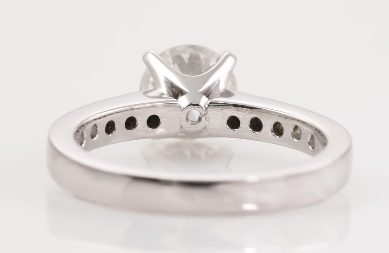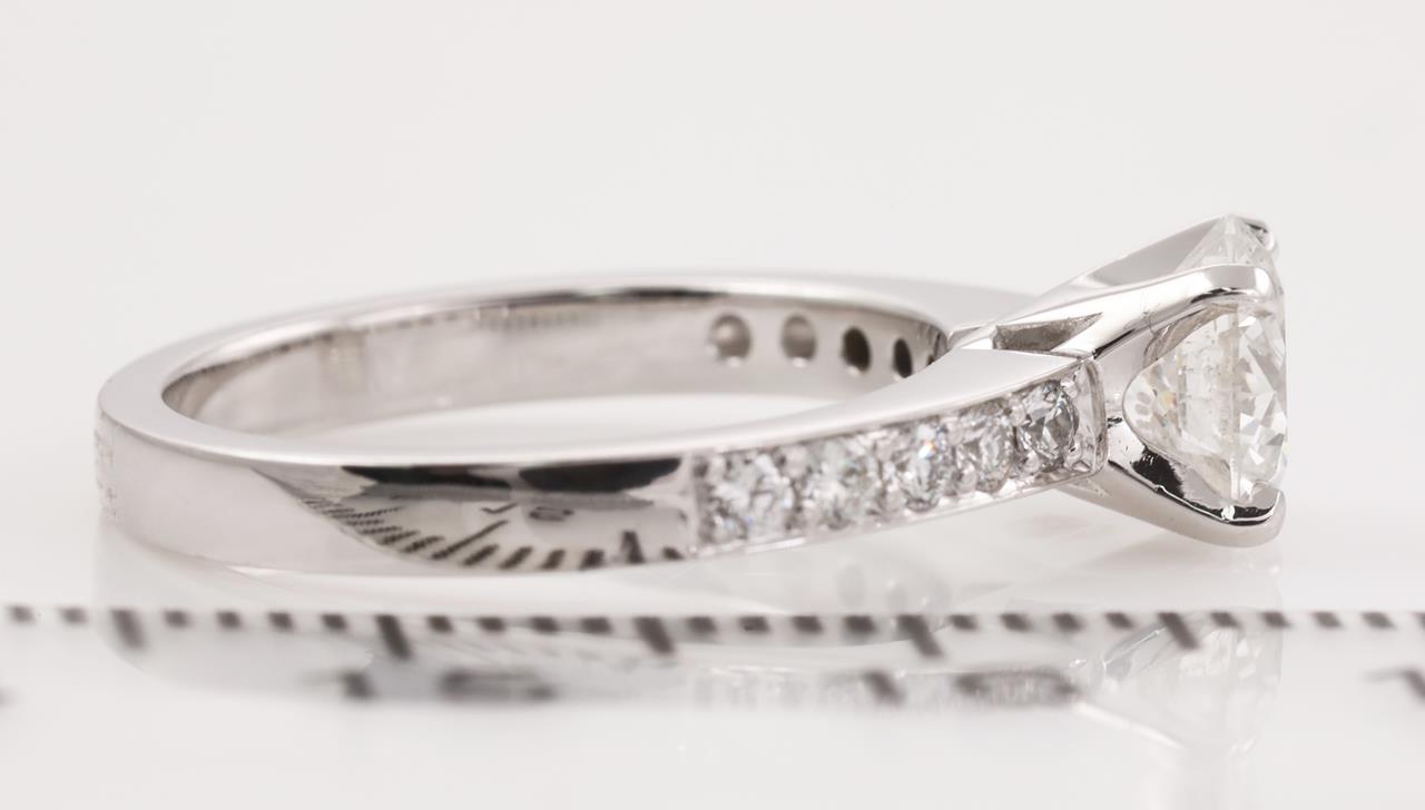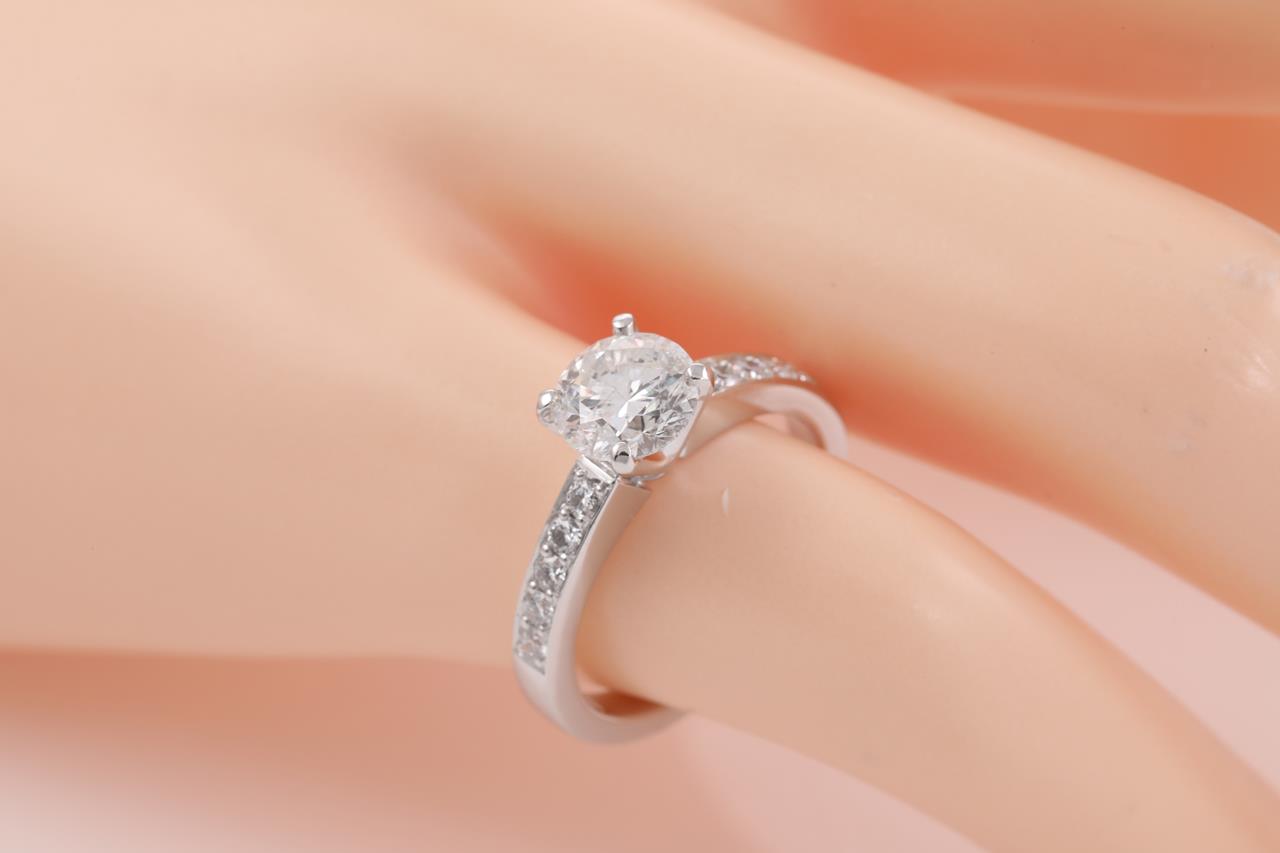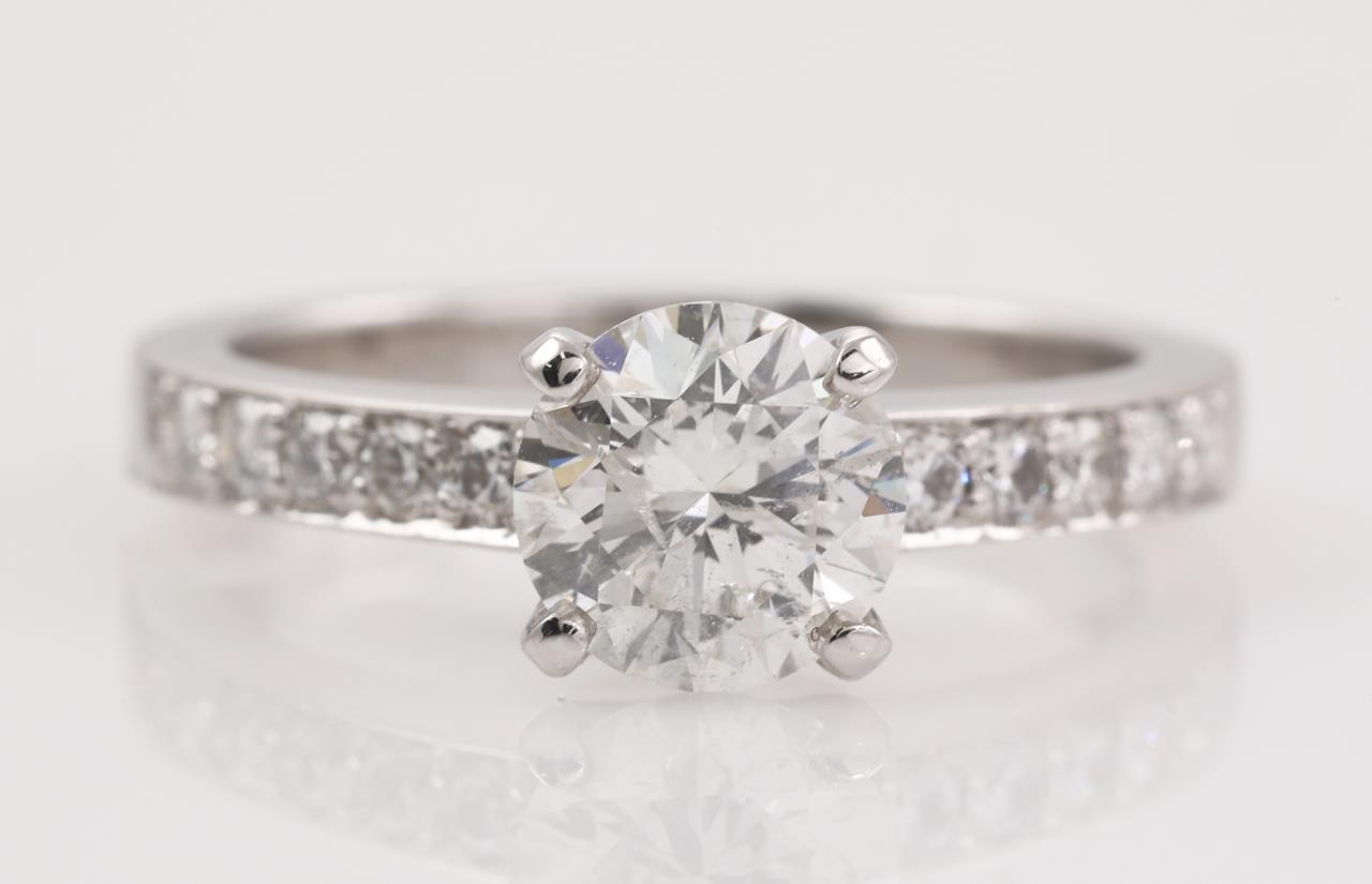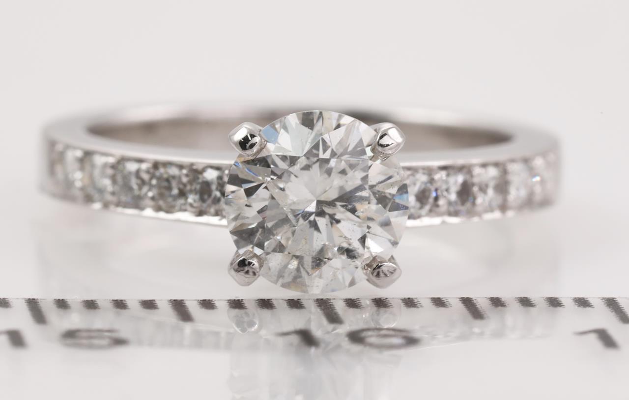 Diamond ring with a centre round brilliant cut diamond of 1.01ct (Estimated grading: H-I P1) and shouder diamonds toalling approximately 0.25cts (Estimated grading: H-I SI) 18ct white gold. Ring size I1/2. Weight: 3.9g. With Certificate #414585. (New).
