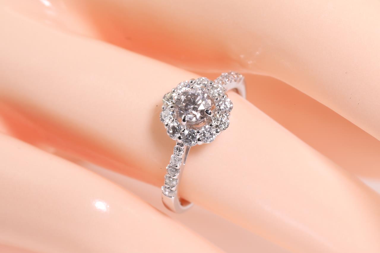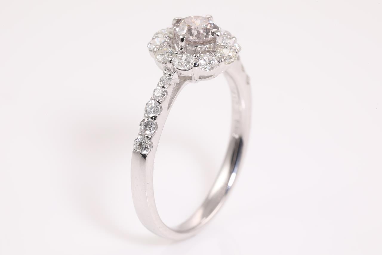 Diamond halo ring with a centre round brilliant cut Diamond of 0.41ct (Estimated grading: Natural Fancy Light Pink P1) and remaining Diamonds totalling 0.60cts ((Estimated grading: H-I SI-P2). Platinum. Ring size L - can be resized 3 sizes up, down by ring clip only. Weight: 3.8g. (Pre-owned)