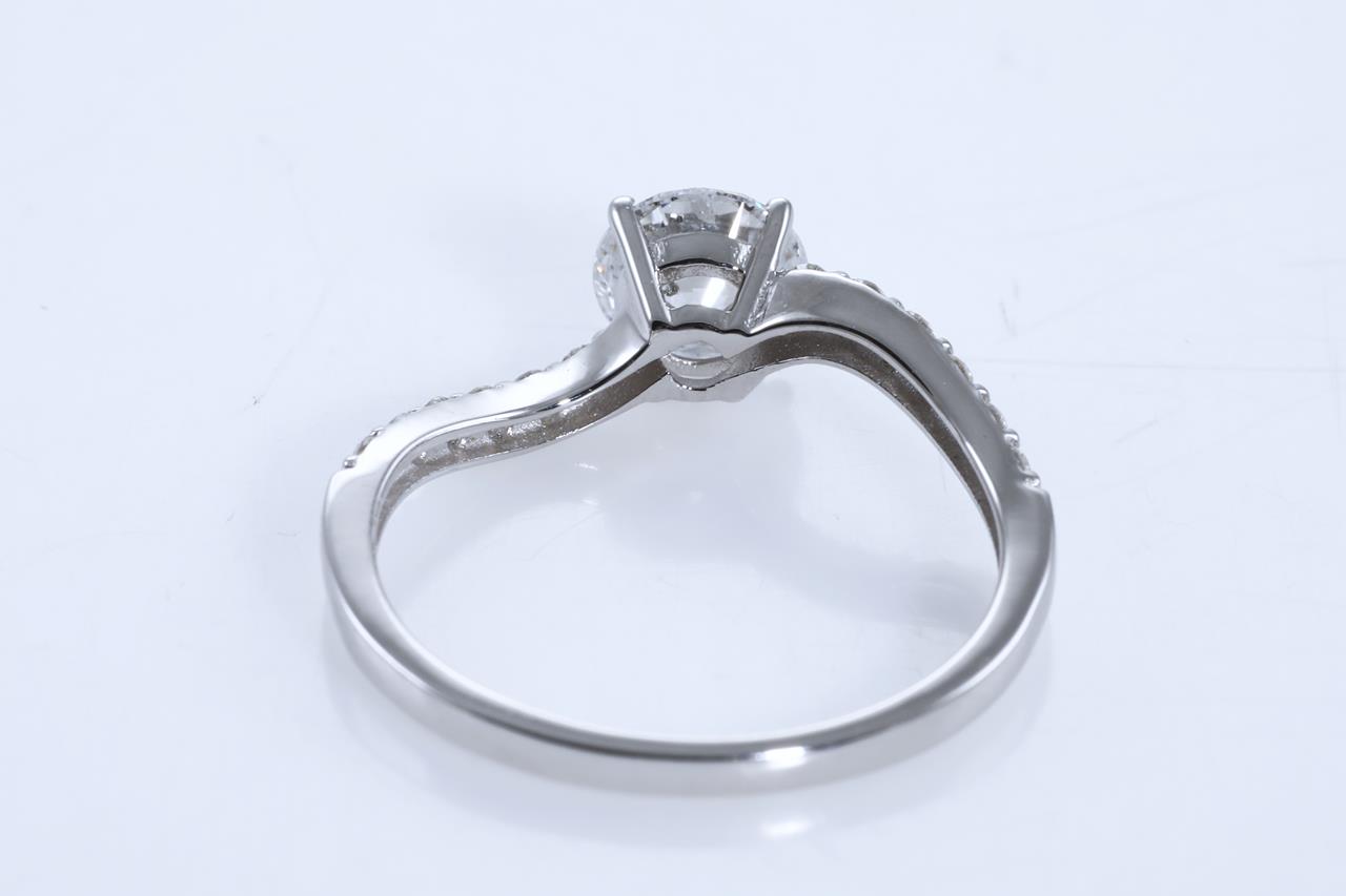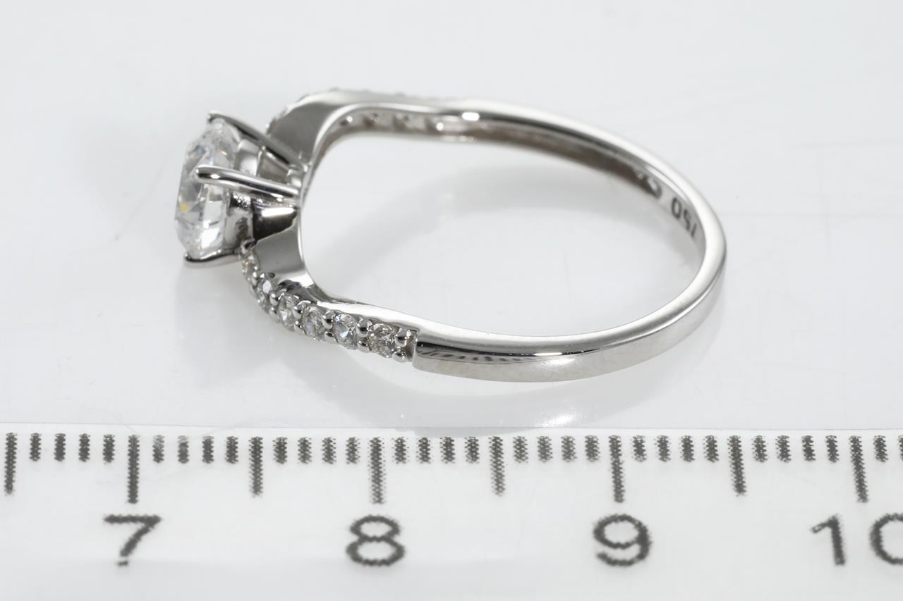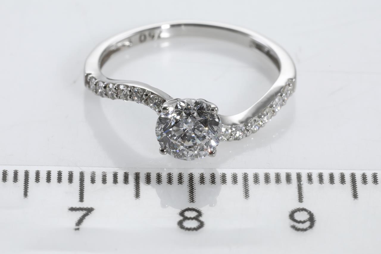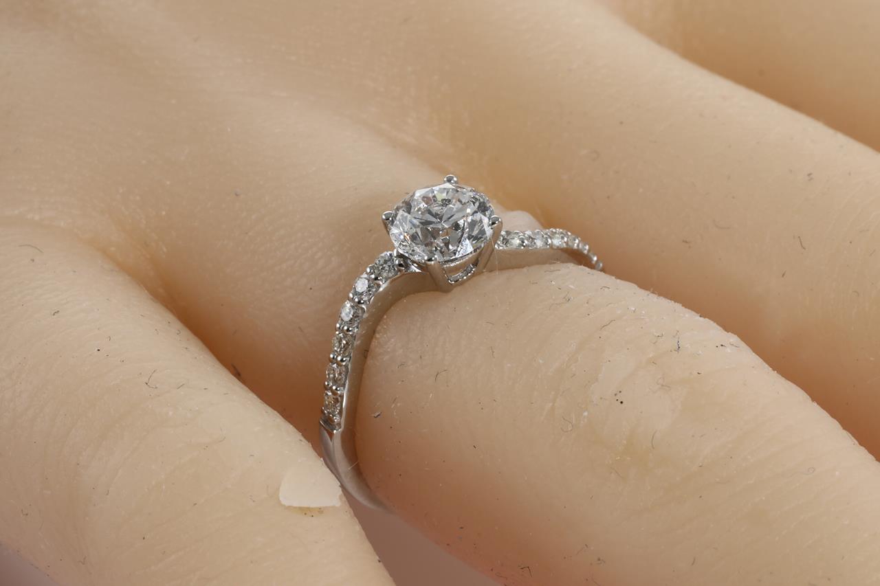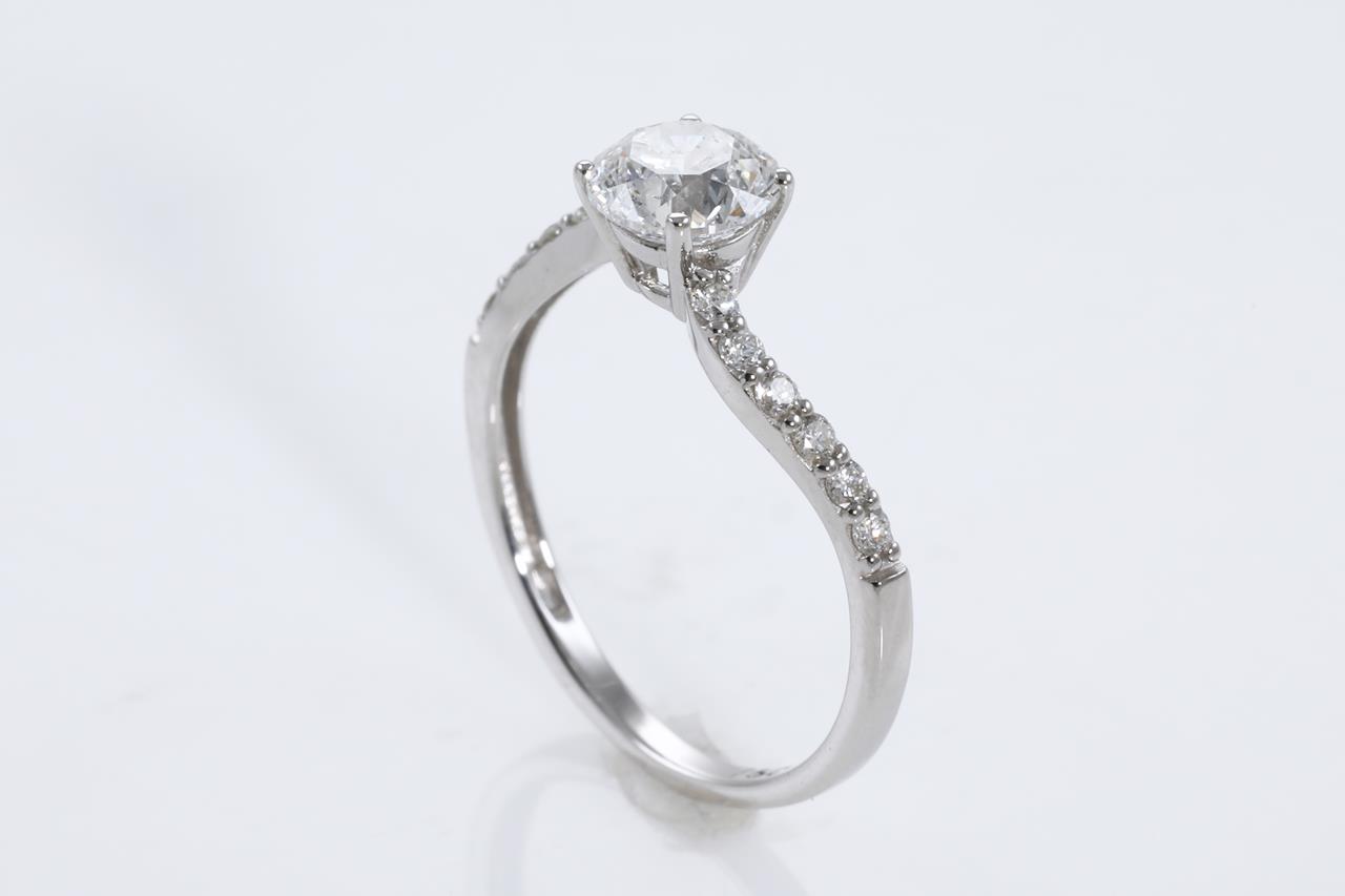 Diamond ring with centre round Diamond of 1.01ct (Estimated grading: F-G P1) and remaining Diamonds totalling 0.21cts. 18ct white gold. Ring size N. Weight: 1.9g (Pre-owned)