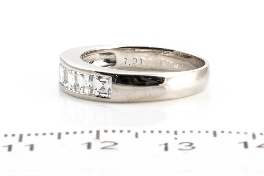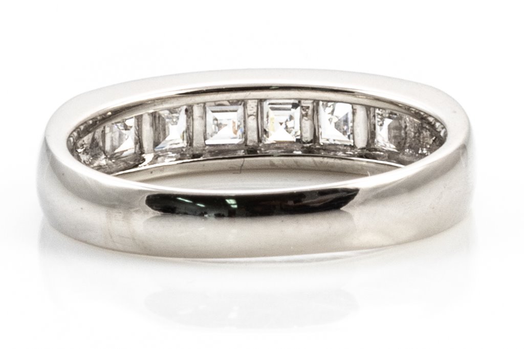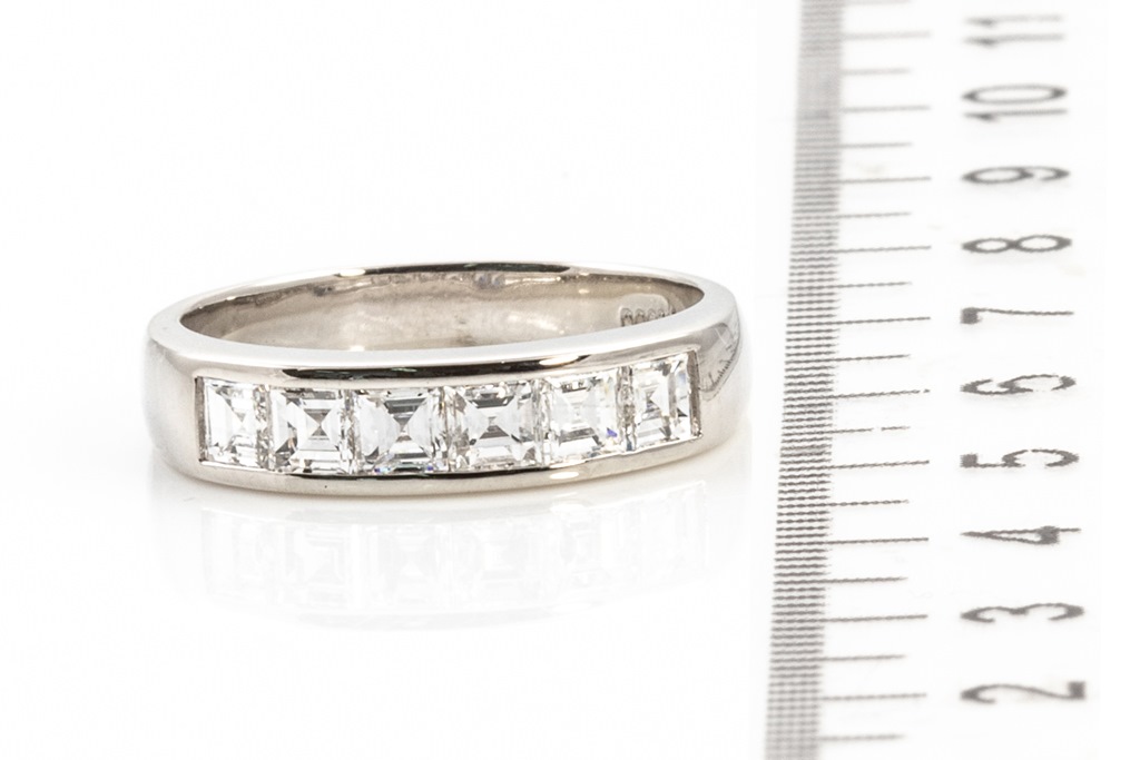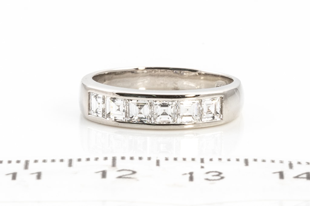 Diamond ring with 6 carre cut Diamonds totalling 1.01cts (Estimated grading: G-H VS). Platinum. Ring size M1/2 - ring resizing is not recommended. Weight: 5.7g. (Pre-owned)