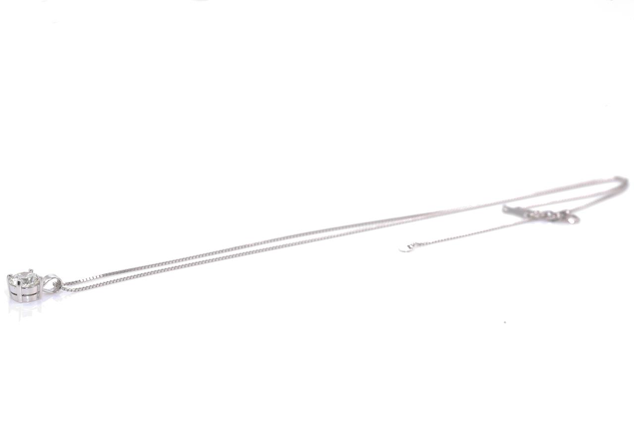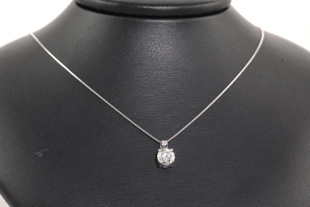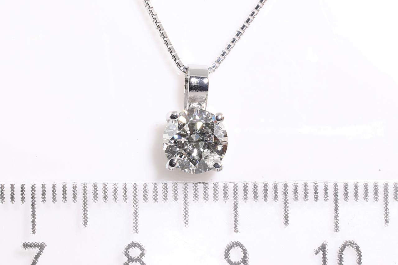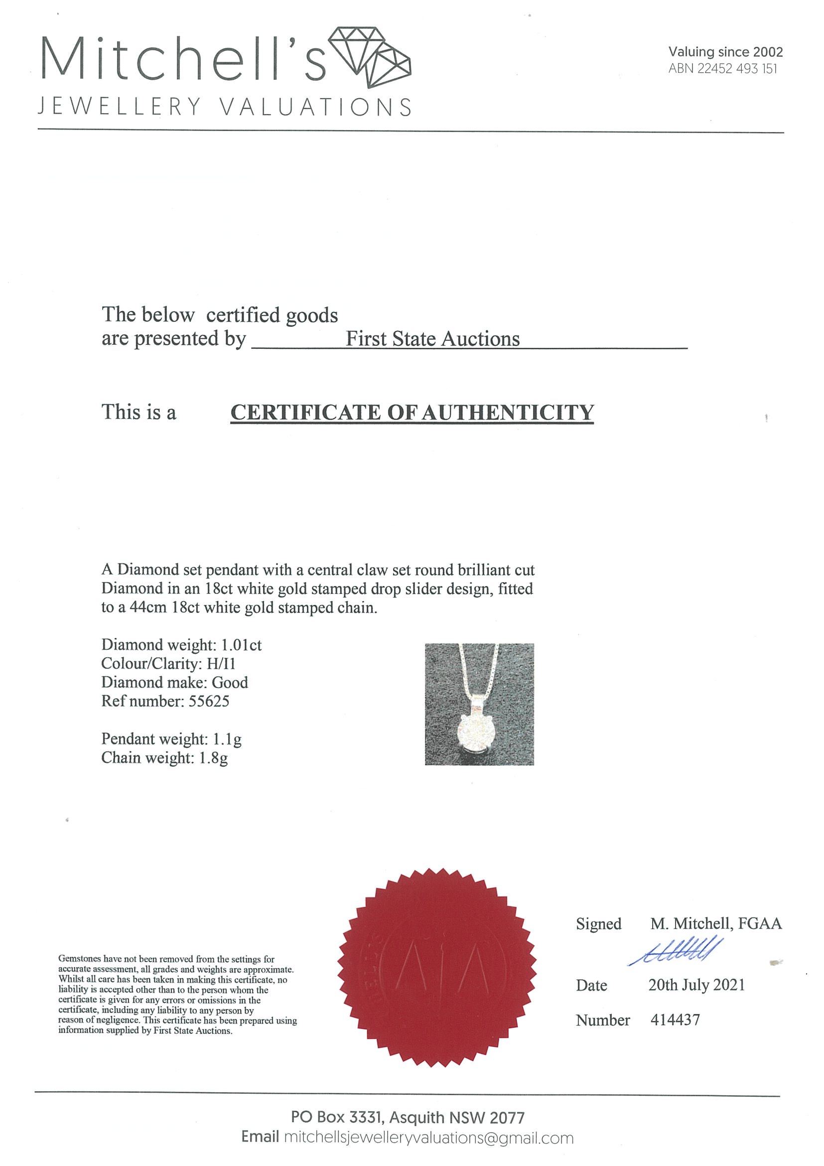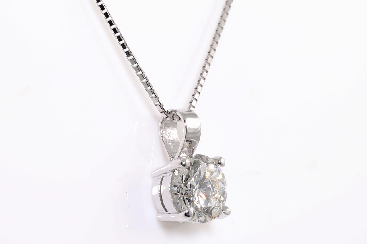 Diamond solitaire pendant with a round Brilliant Cut Diamond of 1.01ct (estimated grading: H P1). 18ct white gold with adjustable 44cm chain. Weight: 2.9g. With Certificate #414437. (Pre-owned)