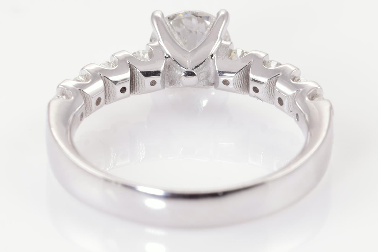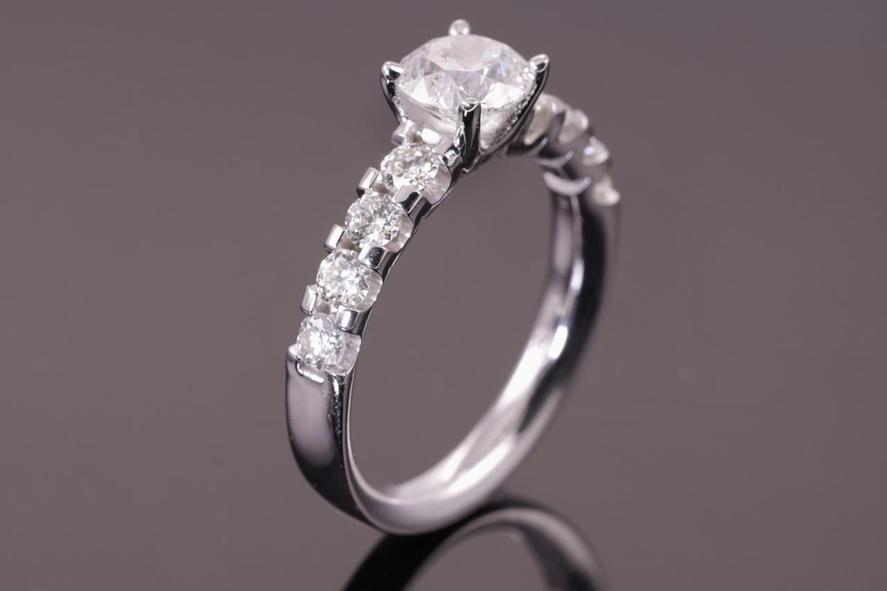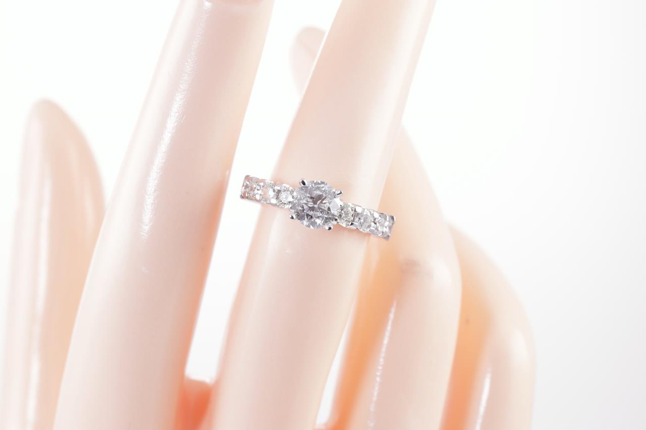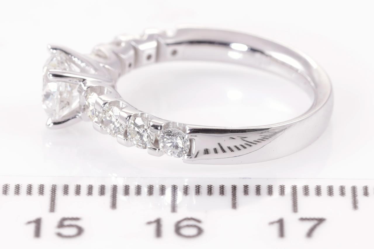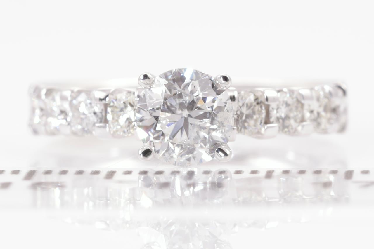 Diamond ring with centre round brilliant cut Diamond of 1.01ct (With GSL memo graded as G P2 #GSL031221-1) and remaining Diamonds totalling 0.62cts (Estimated grading: H-J SI-P1). 18ct white gold. Ring size L1/2. Weight: 4.9g. (New)