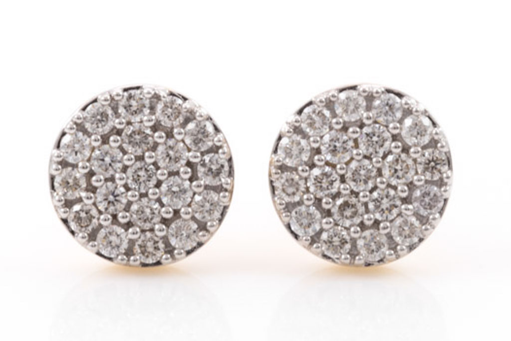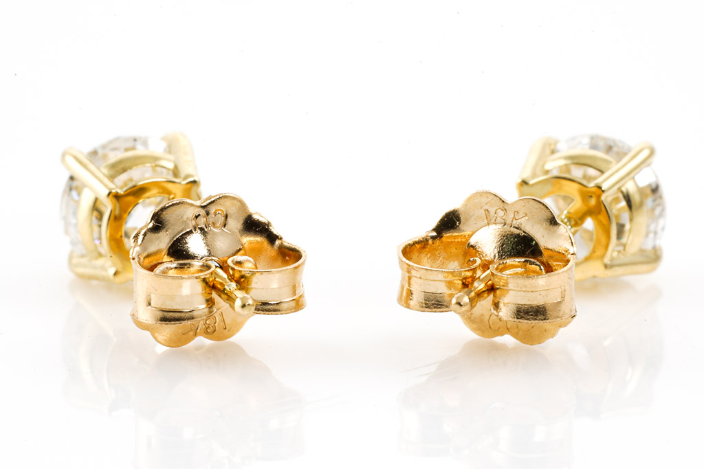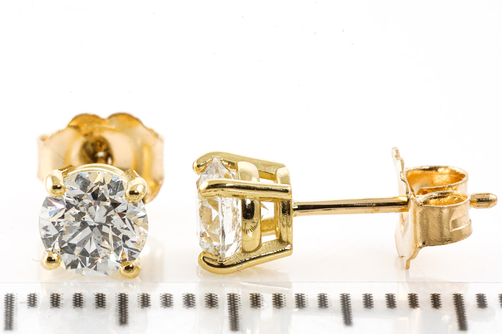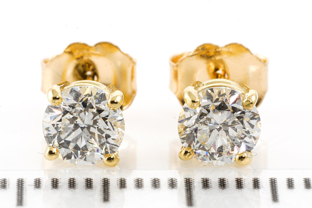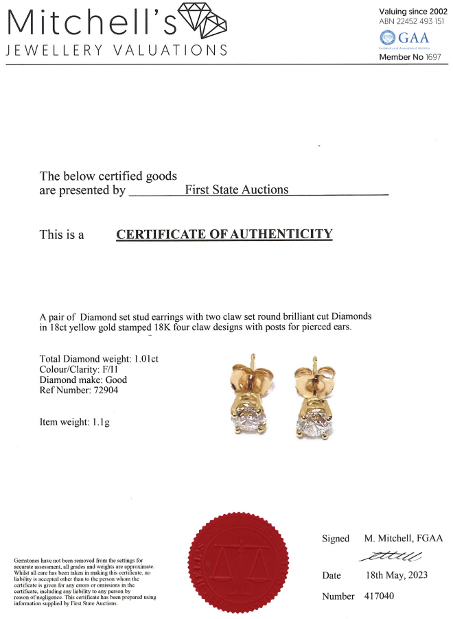 Diamond stud earrings with 2 round brilliant cut Diamonds totalling 1.01cts (Estimated grading: F P1). 18ct yellow gold. Weight: 1.1g. With certificate #417040. (New)