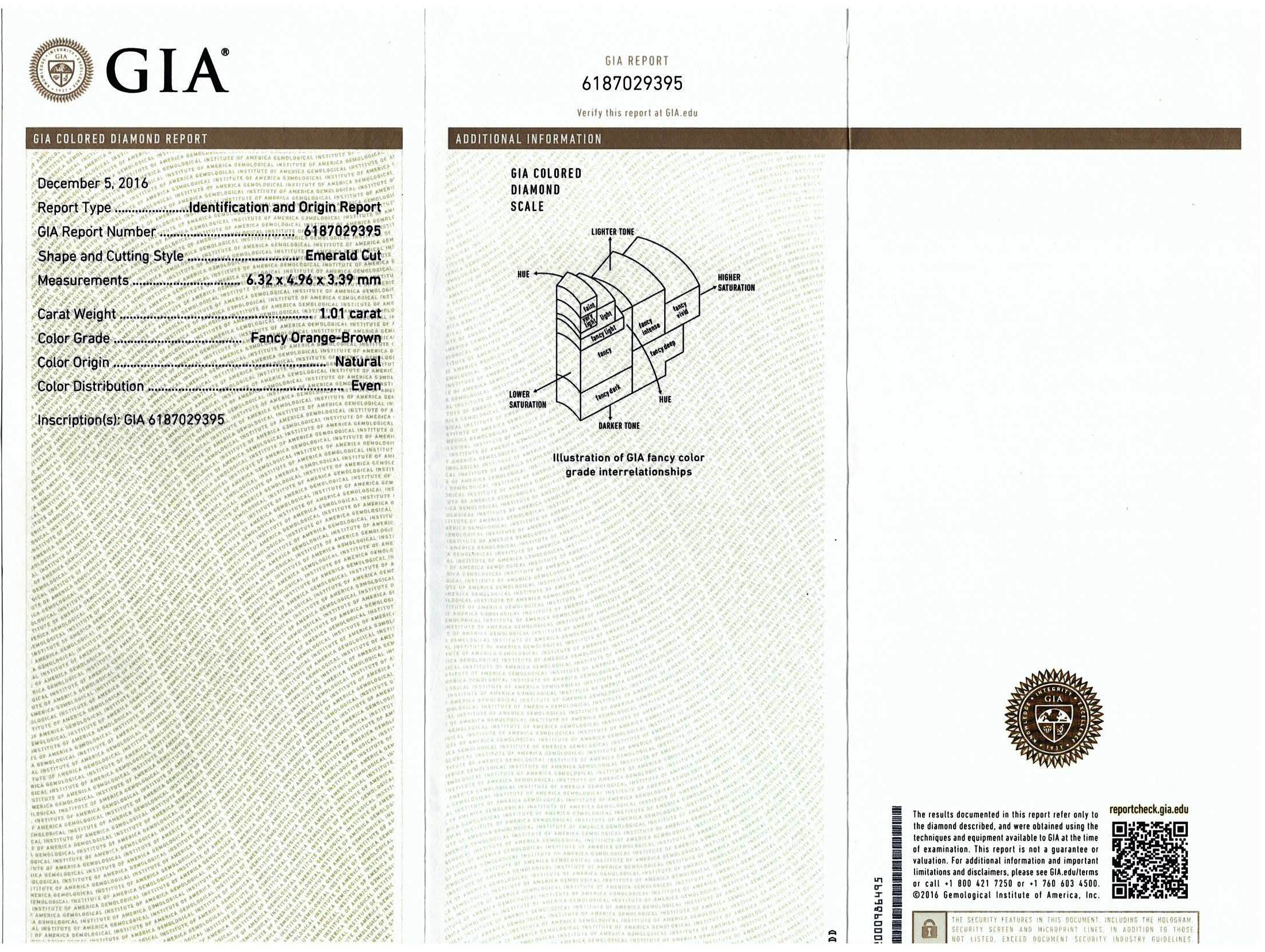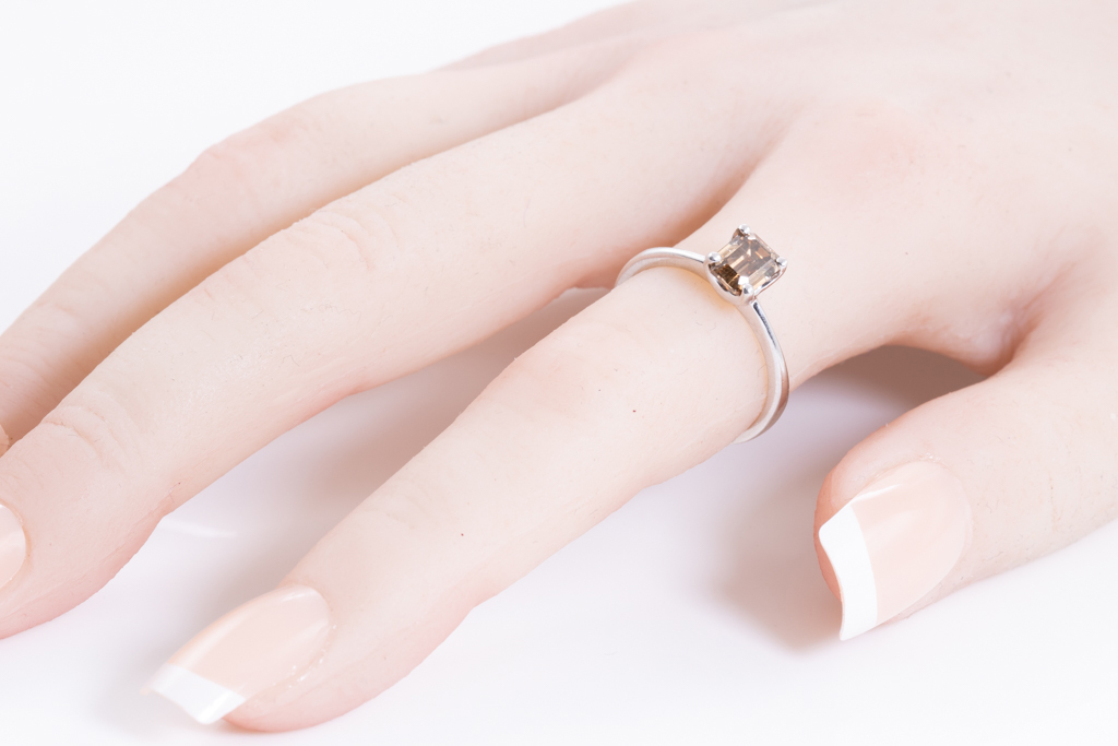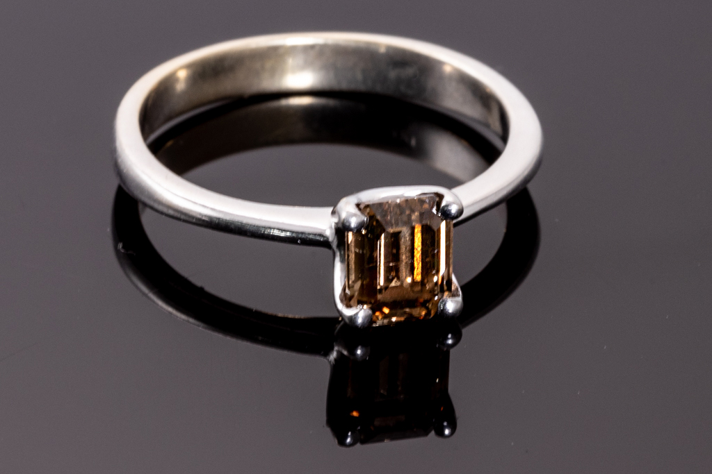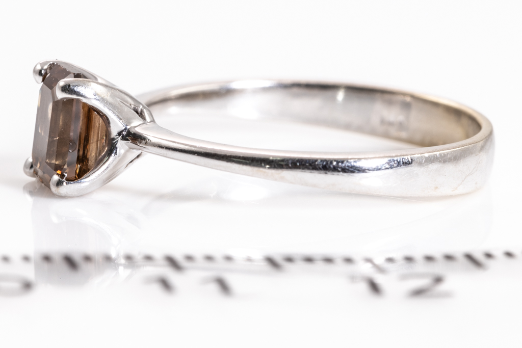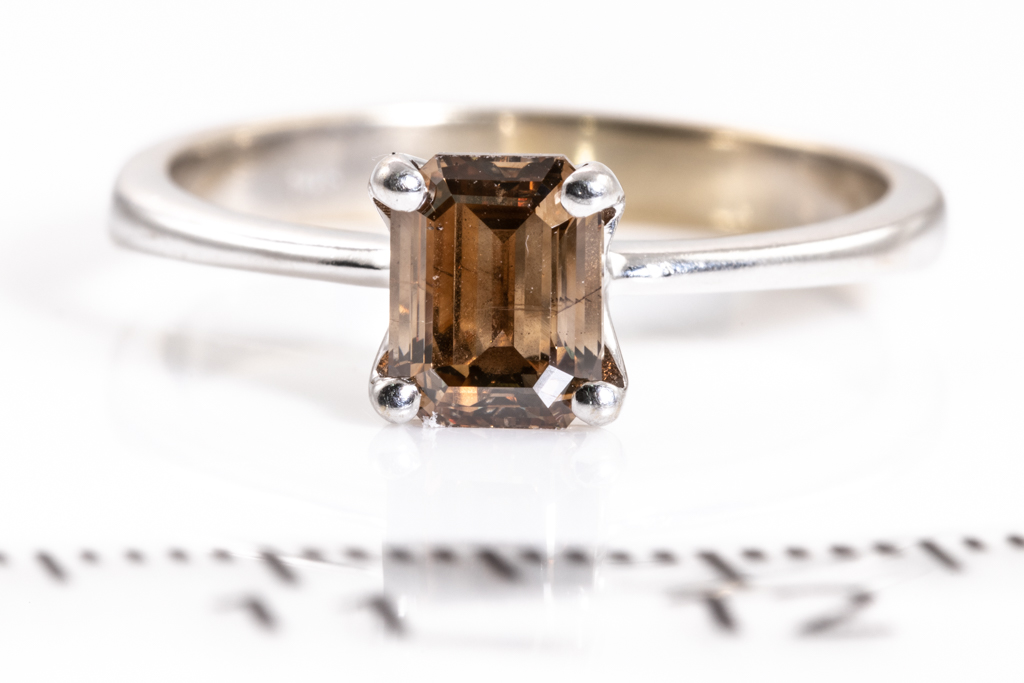 Diamond solitaire ring with emerald cut Diamond of 1.01ct (With GIA report graded as: Natural Fancy Orange-Brown #6187029395) FSA estimated clarity grade: SI). 14ct white gold. Ring size N. Weight 2.5g. (Pre-owned)