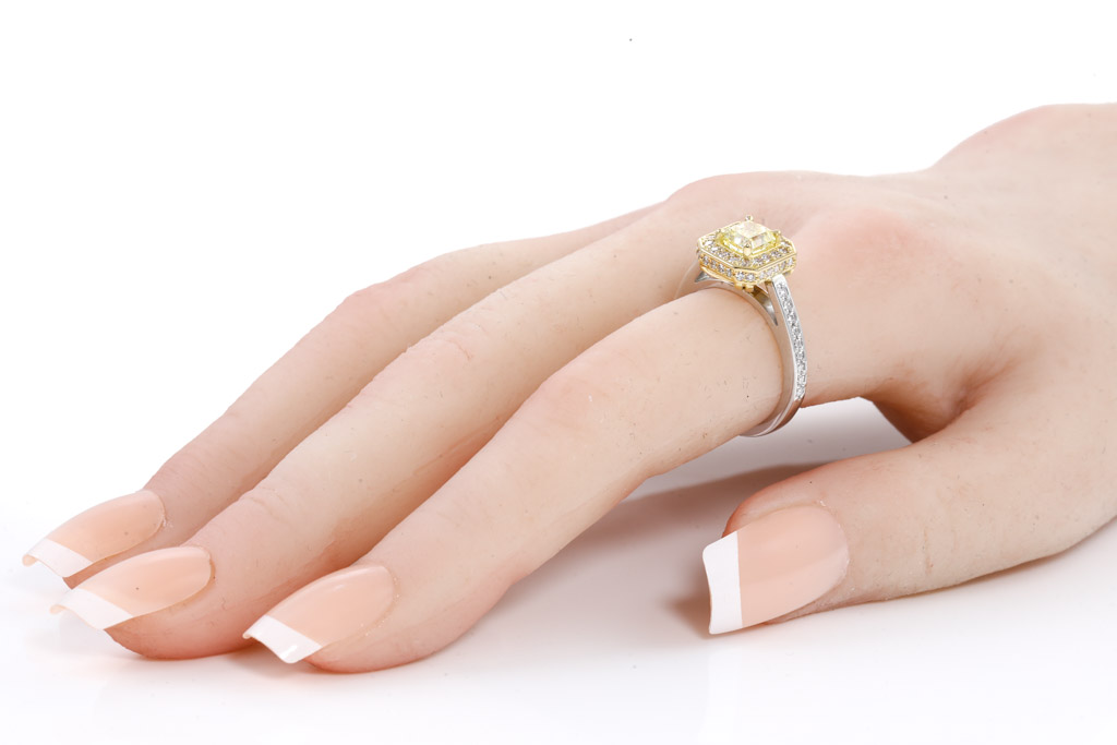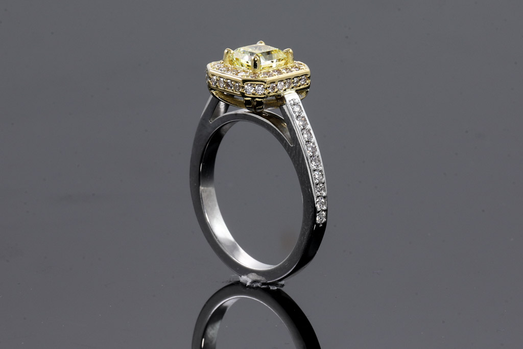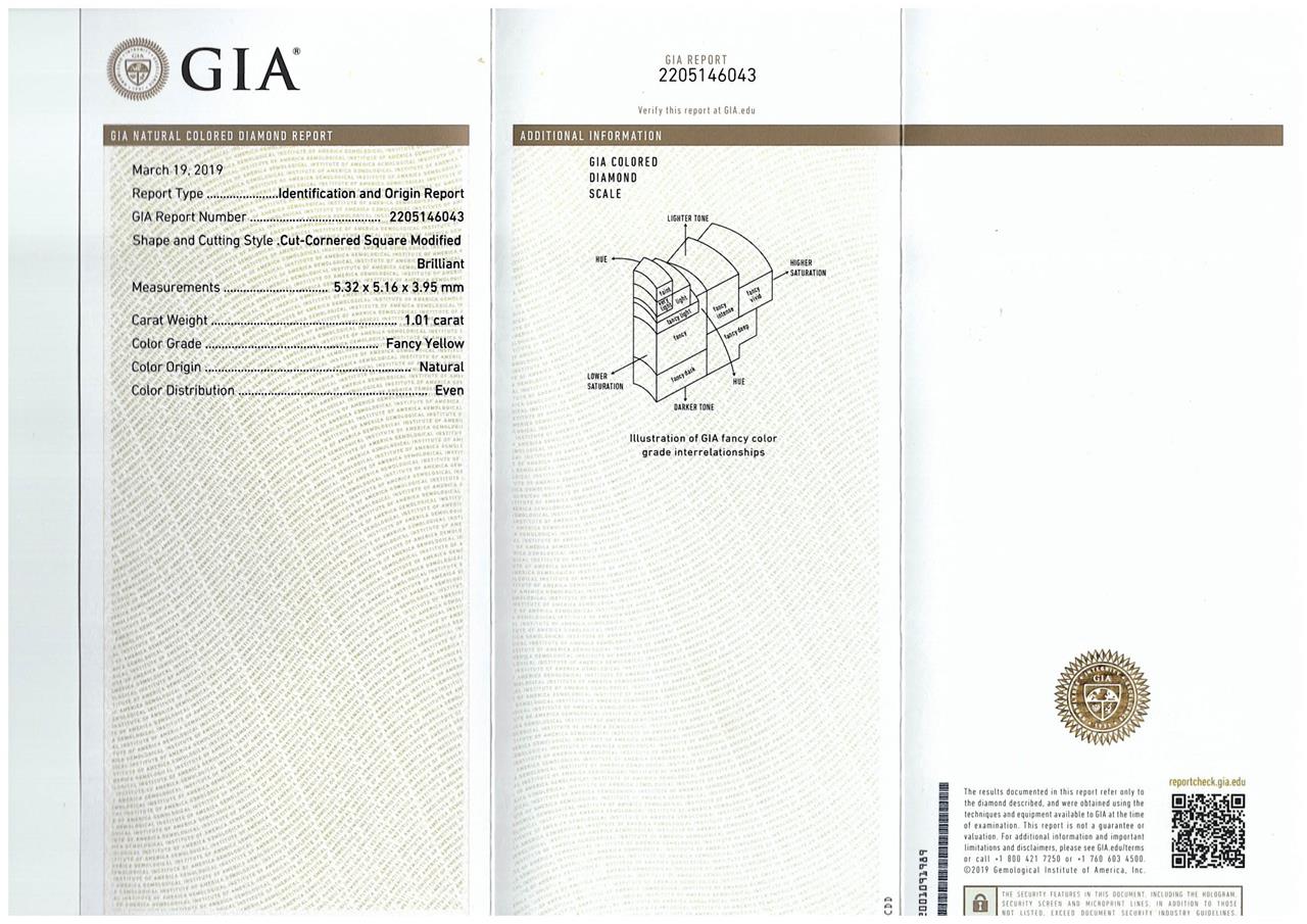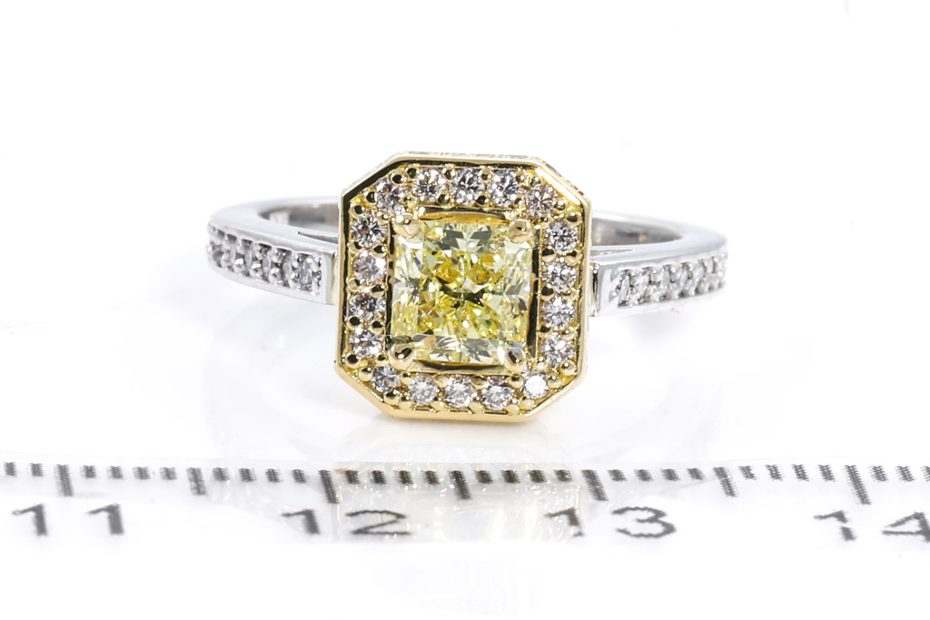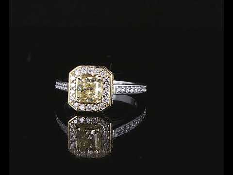 Diamond Dress ring with radiant cut Diamond of 1.01ct (with GIA report graded as Natural Fancy Yellow Even #2205146043 : FSA Estimated clarity grade: P1) and surrounding diamonds totalling 0.64ct (Estimated grading: G VS-SI). 18ct white and yellow gold. Ring size: M. Weight: 6.6g. (New)