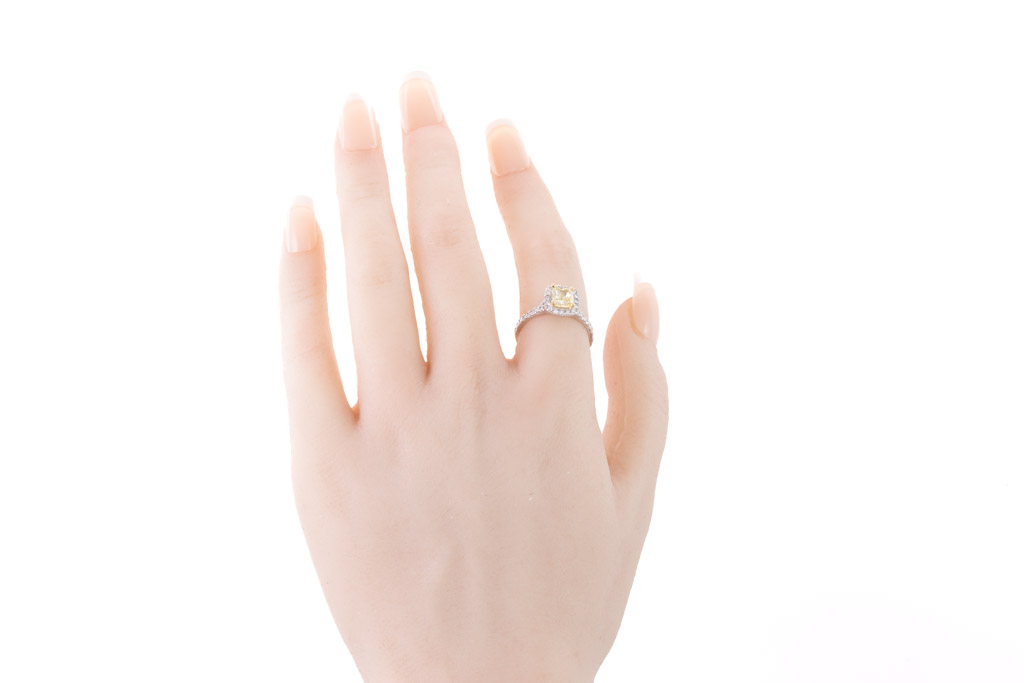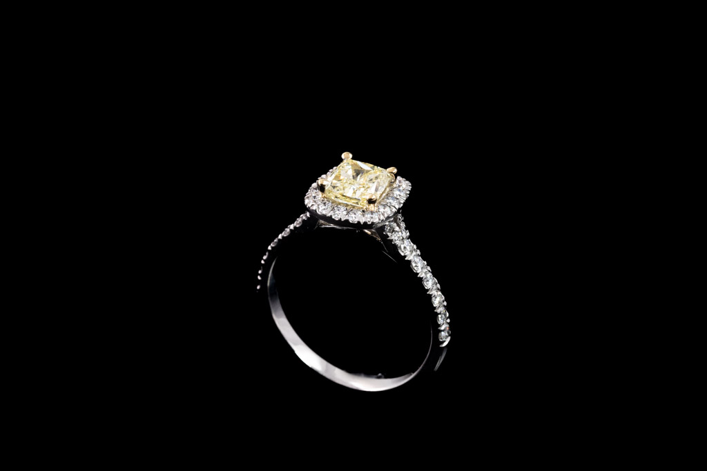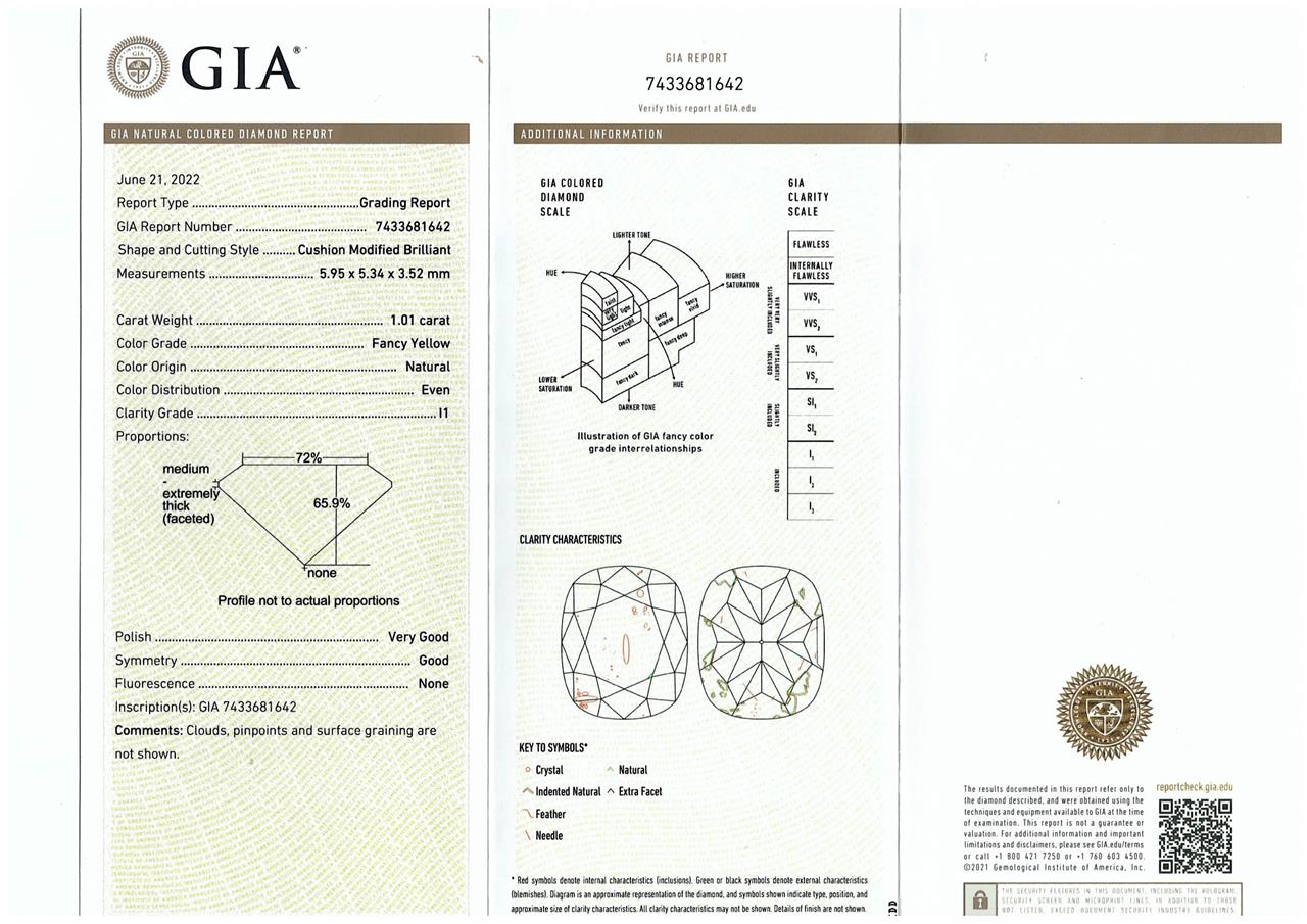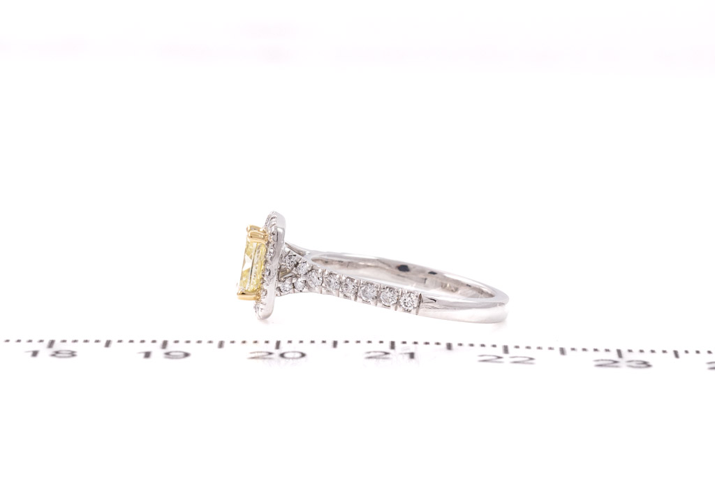 Diamond halo ring with centre cushion cut Diamond of 1.01ct (With GIA report graded as Natural Fancy Yellow P1 #7433681642) and surrounding round Diamonds totalling 0.47cts (Estimated grading: G-H VS-SI). 18ct yellow and white gold. Ring size L1/2. Weight 4.2. (New)