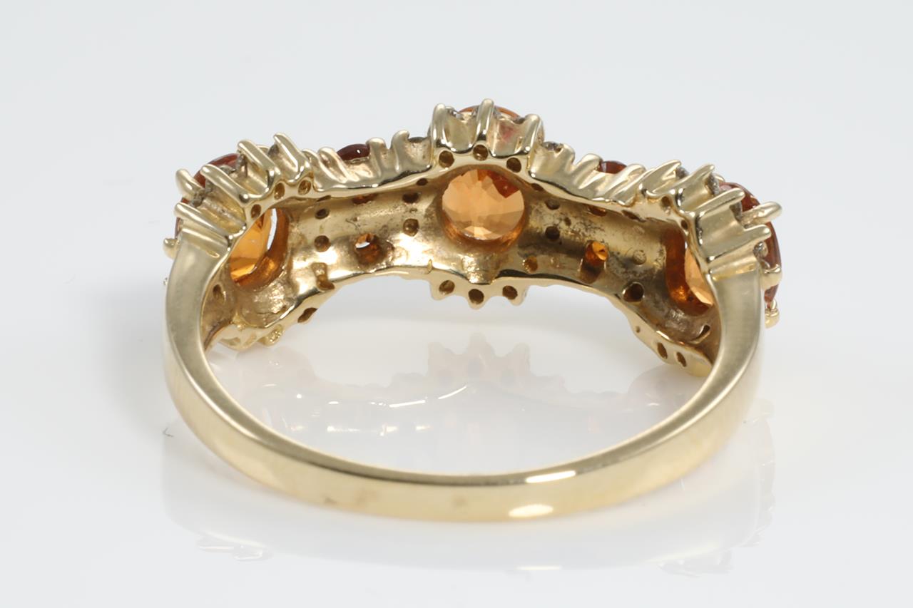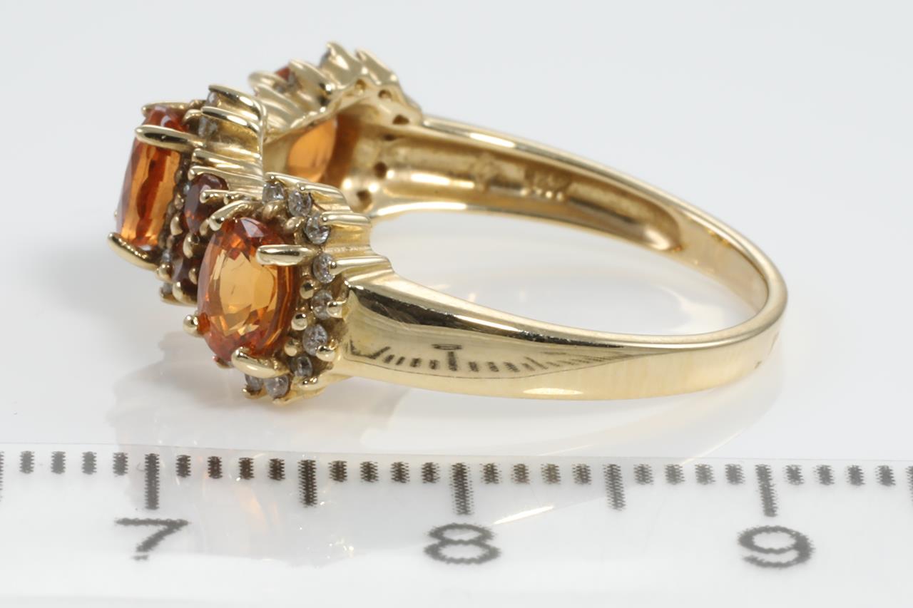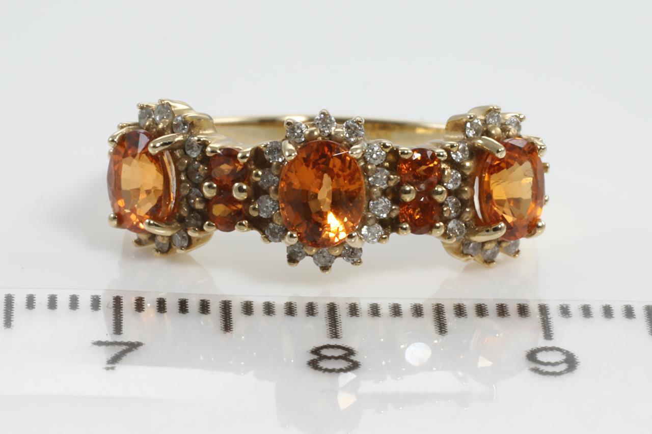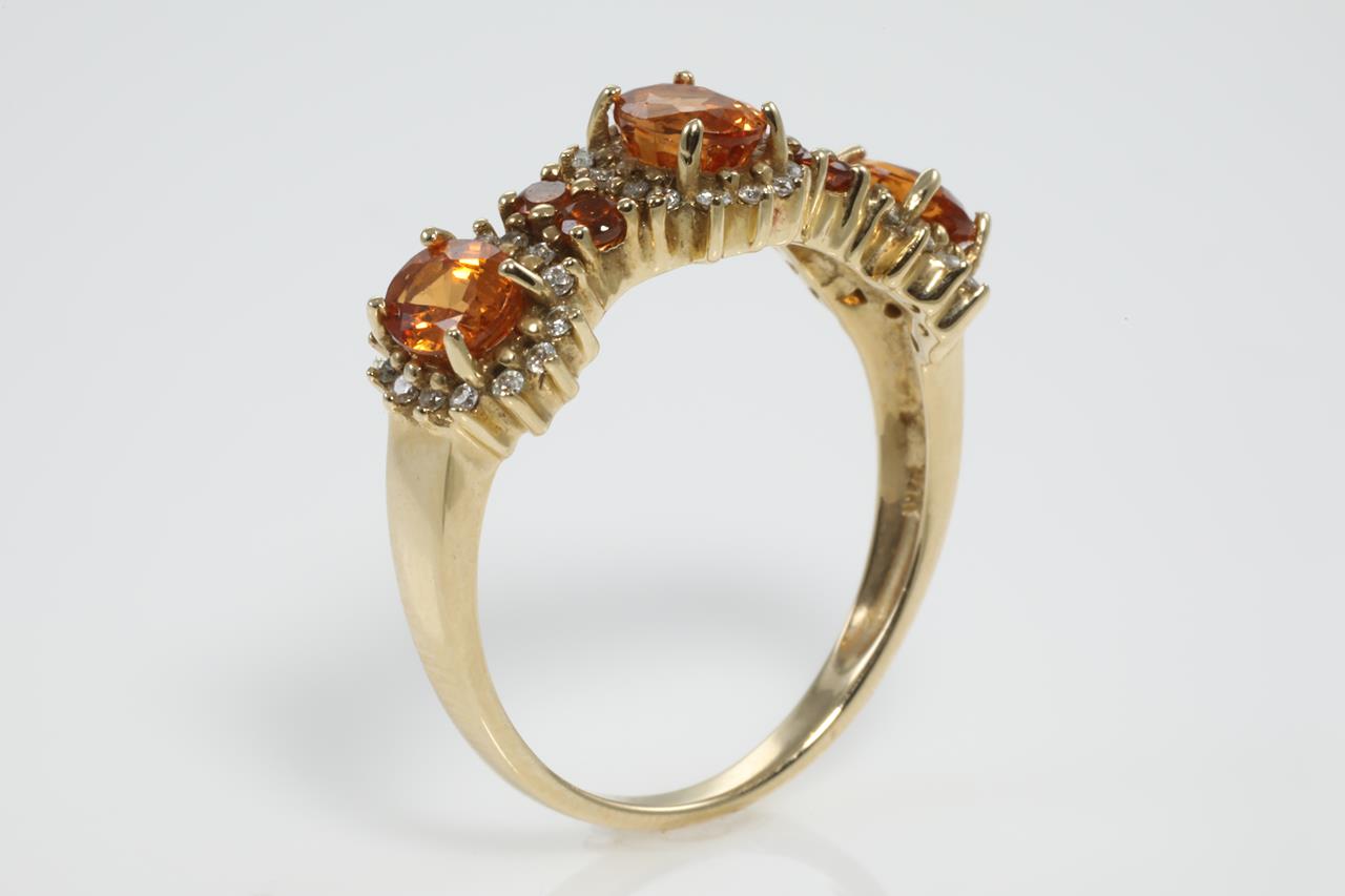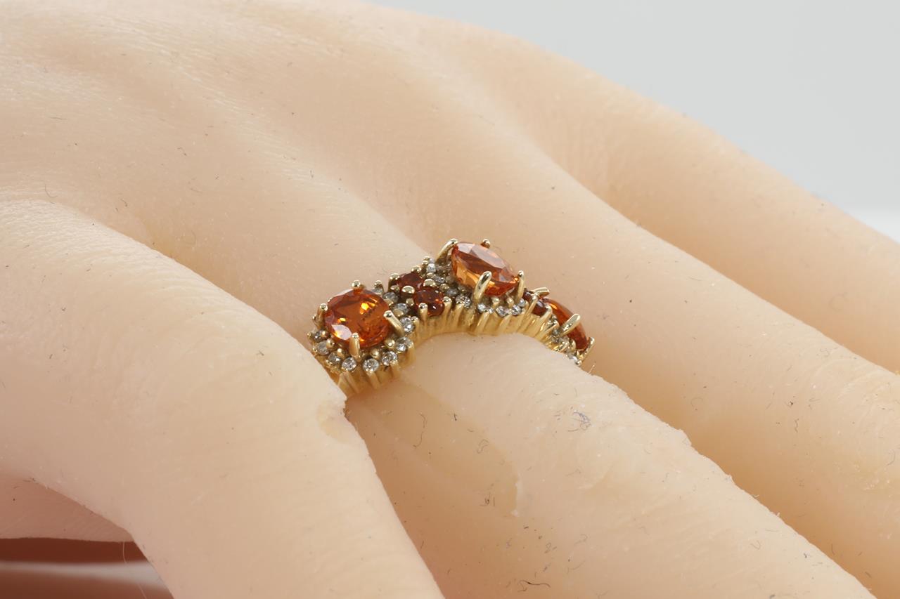 Garnet and Diamond ring with round & oval shape Mandarin Garnet totalling 1.01cts and Diamonds totalling 0.20cts. 14ct yellow gold. Ring size N1/2. Weight: 3.7g (As New)