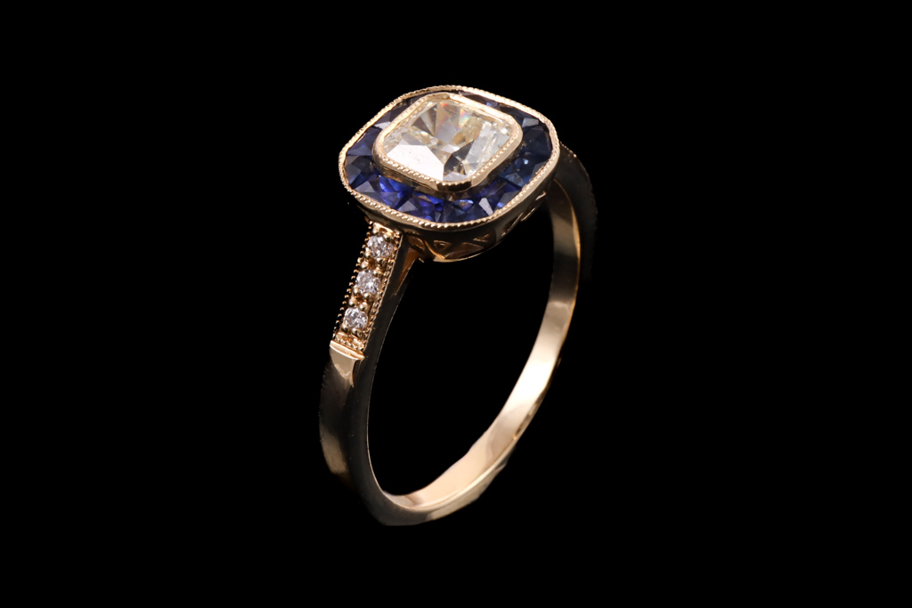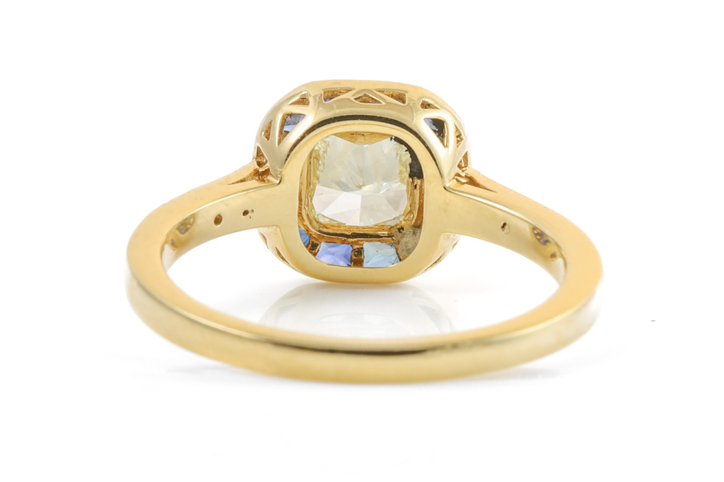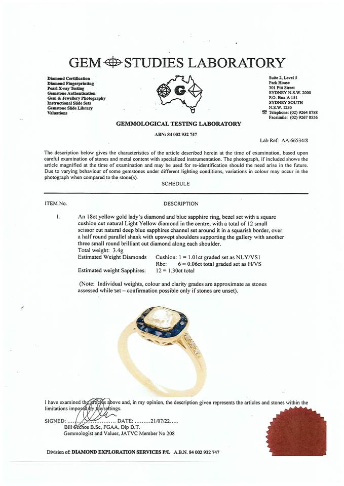 Diamond and Sapphire ring with cushion cut Diamond of 1.01ct (with copy of GSL Description Certificate graded as NLY VS1 #AA6534/8), round Diamonds totalling 0.06cts and fancy cut dark blue Sapphires totalling 1.30cts. 18ct yellow gold. Ring size M 1/2. Weight 3.5g. (Pre-owned)