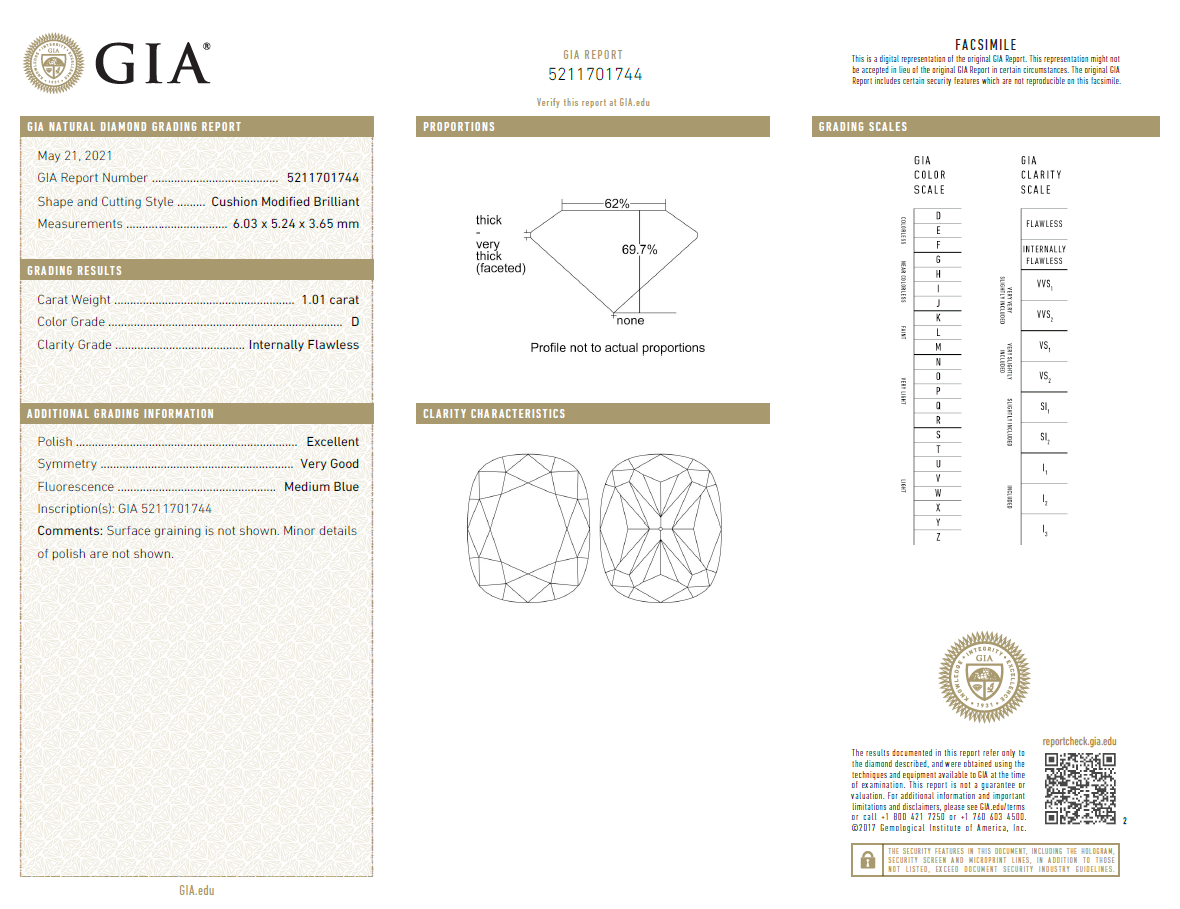 A loose Cushion cut Diamond of 1.01ct (With GIA report graded as D IF #5211701744). (New)