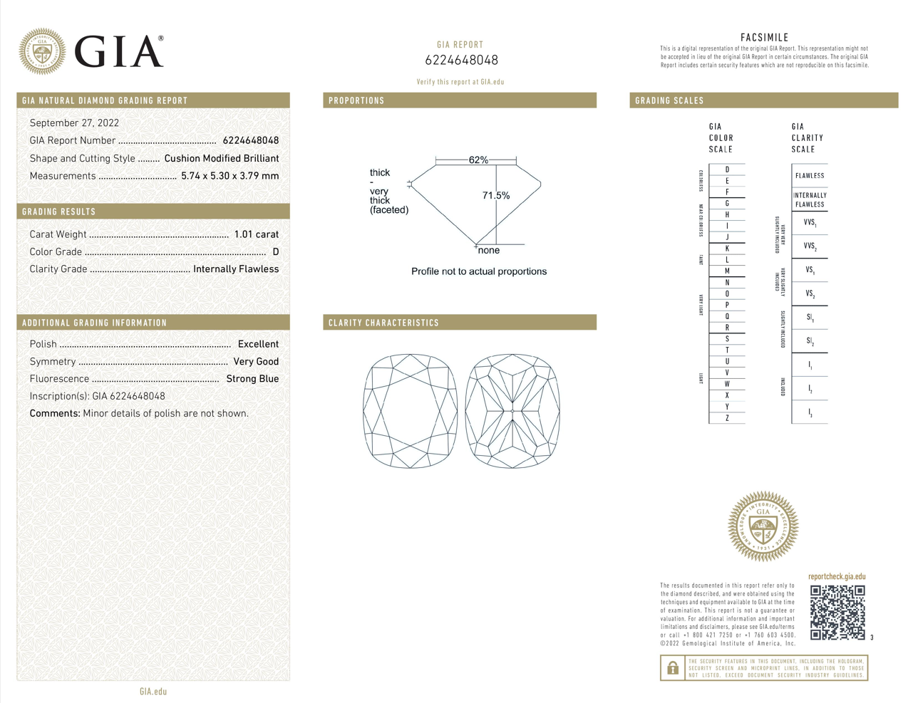 A loose cushion cut Diamond of 1.01ct (with GIA report graded as D IF #6224648048). (New)