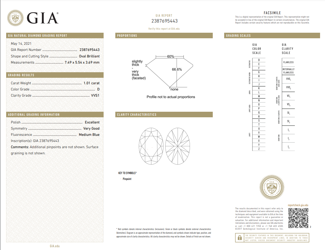 A loose Oval shape Diamond of 1.01ct (with GIA report graded as D VVS1 #2387695443). (New)