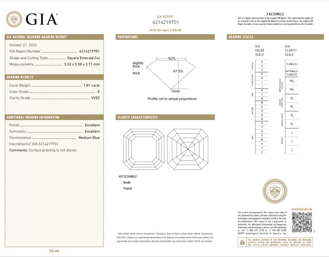 A loose square emerald Diamond of 1.01ct (with GIA report graded as E VVS2 #6214219701). (New)