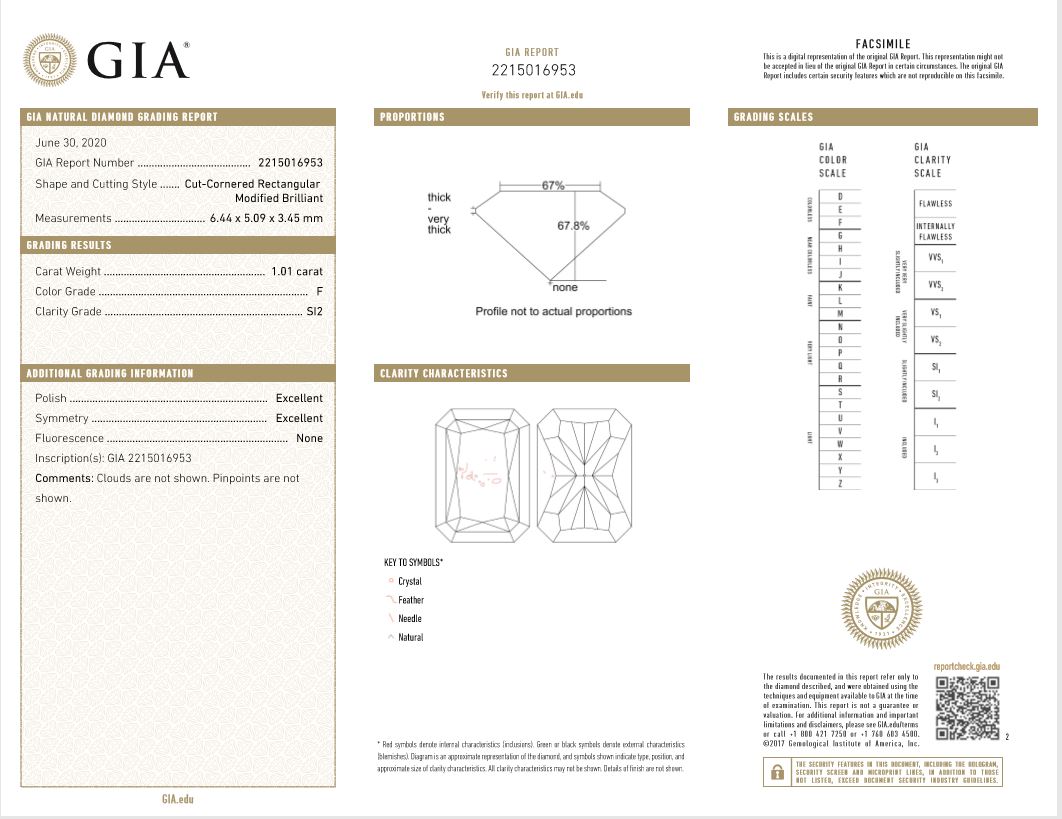 A loose Radiant cut Diamond of 1.01ct (with GIA report graded as F SI2 #2215016953). (New)