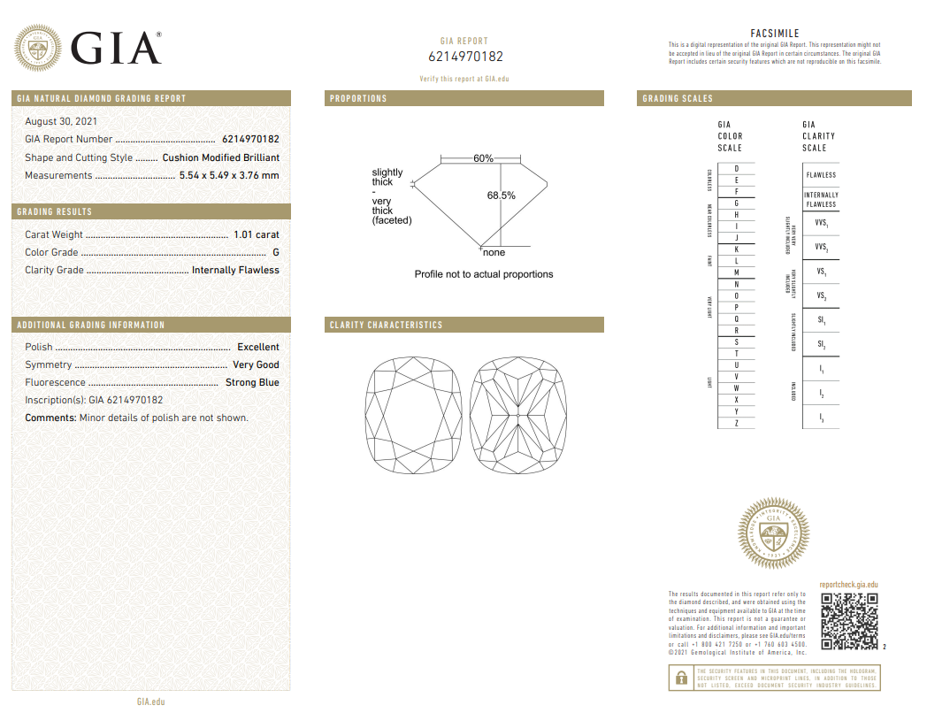 A loose cushion cut Diamond of 1.01ct (With GIA report graded as G IF #6214970182). (New)
