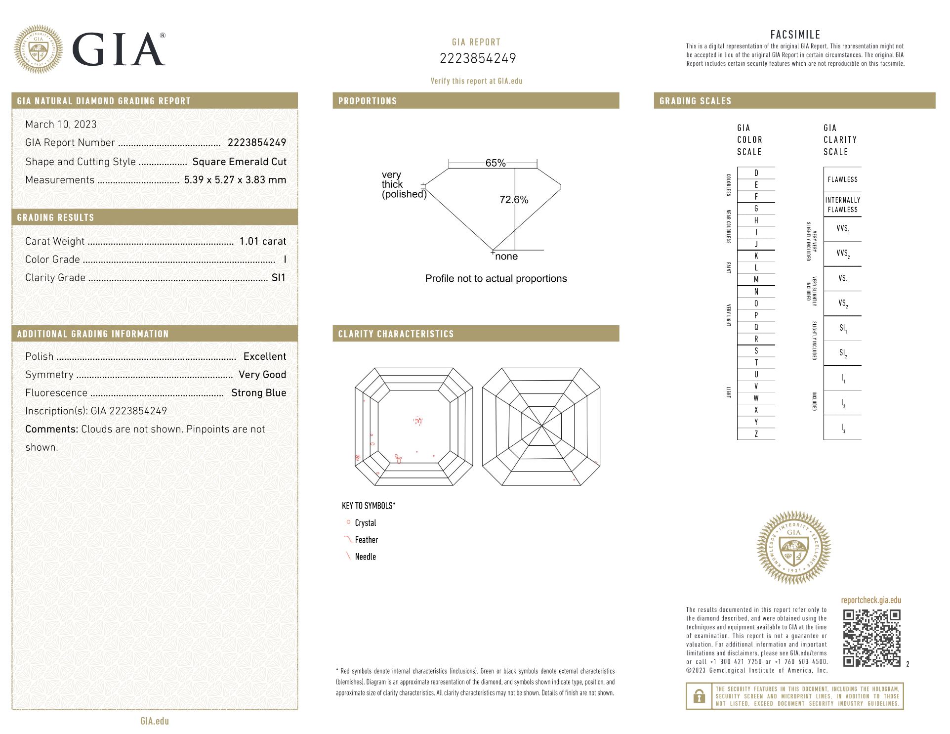 A loose square emerald cut Diamond of 1.01ct (With GIA report graded as I SI1 #2223854249).(New)