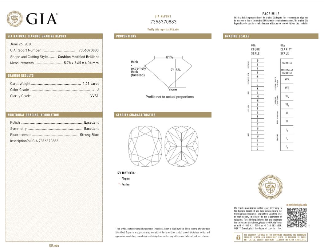 A loose Cushion Cut Diamond of 1.01ct (with GIA Report graded as J VVS1 #7356370883