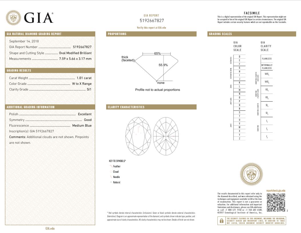 A loose oval shape Diamond of 1.01ct (with GIA report graded as W-X SI1 #5192667827). (New)