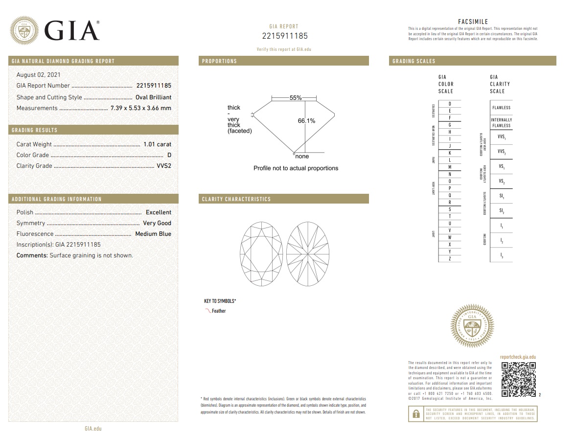 A loose oval shape Diamond of 1.01ct (With GIA report graded as D VVS2 #2215911185). (New)