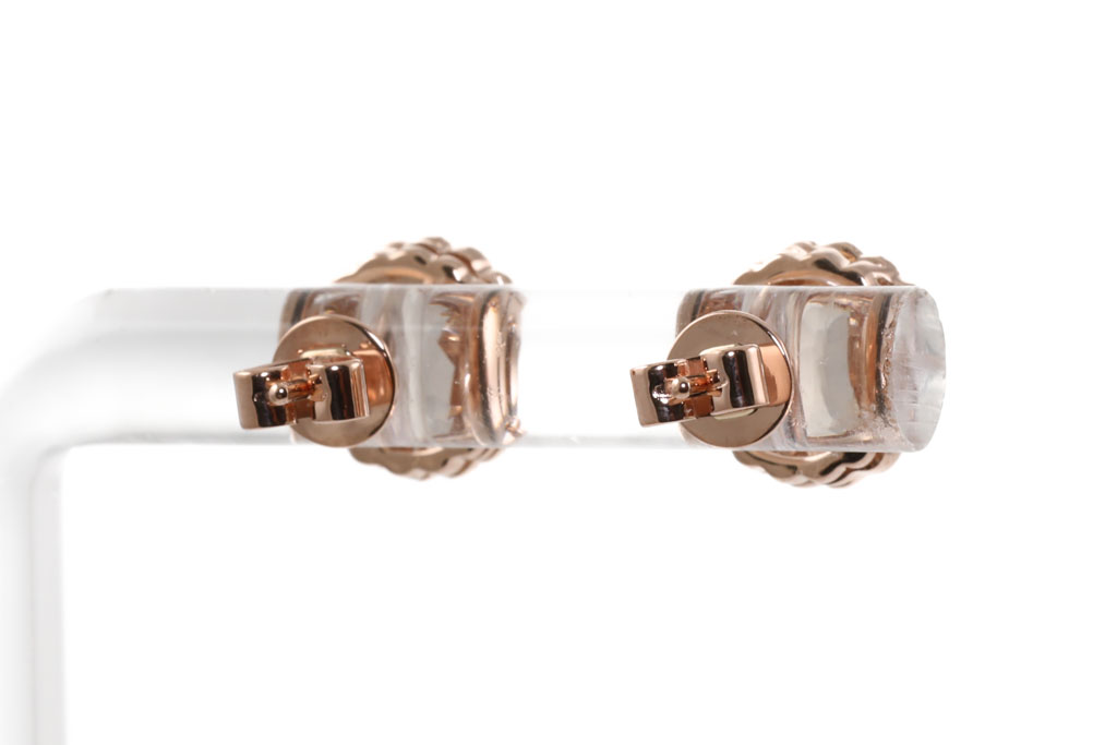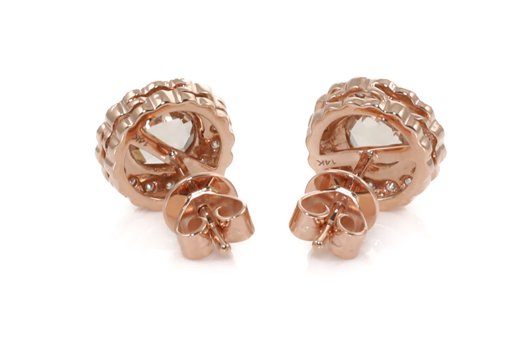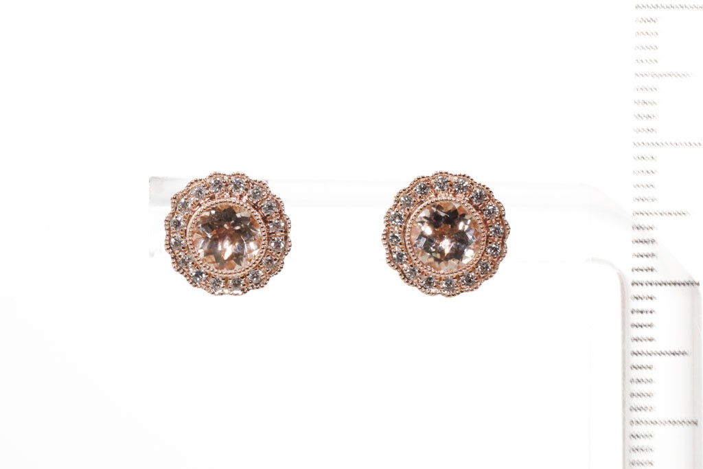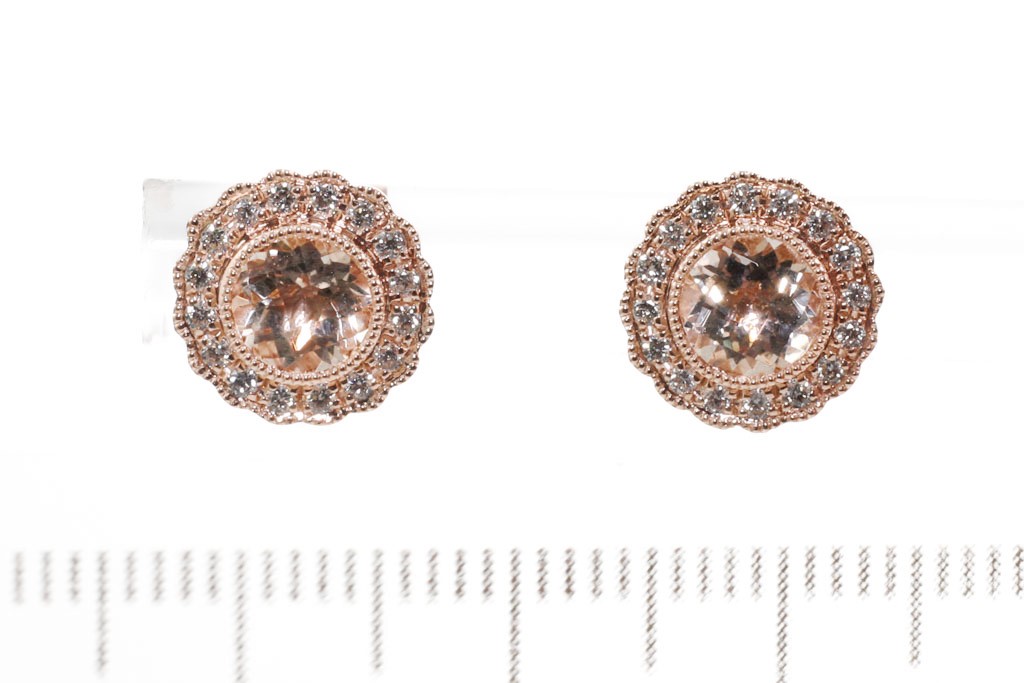 Morganite and Diamond earrings with round Morganite totalling 1.01cts and round Diamonds totalling 0.16cts. 14ct rose gold. Weight: 2.2g. (New)