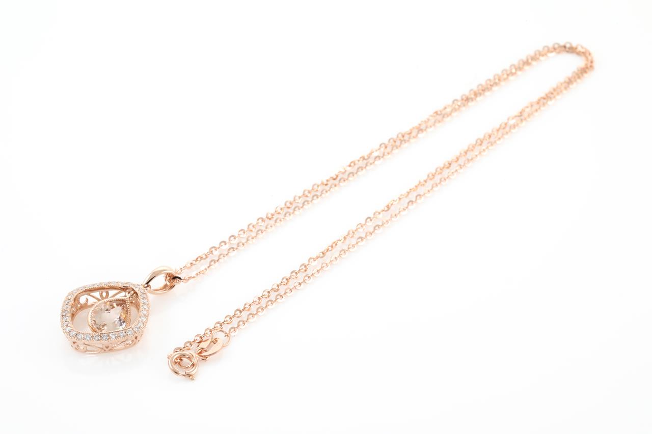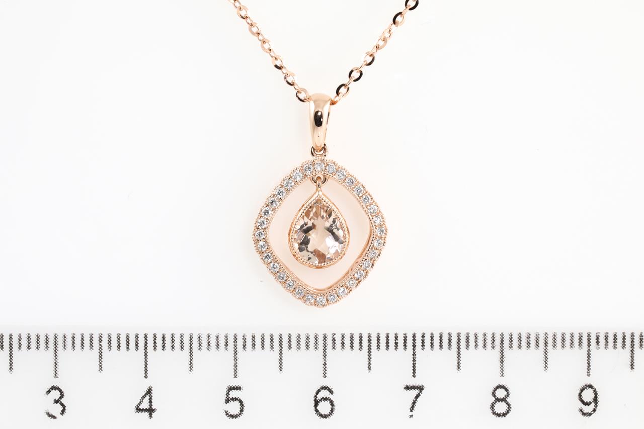 Morganite and Diamond pendant with pear shape Morganite of 1.01ct and Diamonds totalling 0.20cts. 14ct Rose gold with 18ct rose gold 45cm chain. Weight: 5.7g (New)