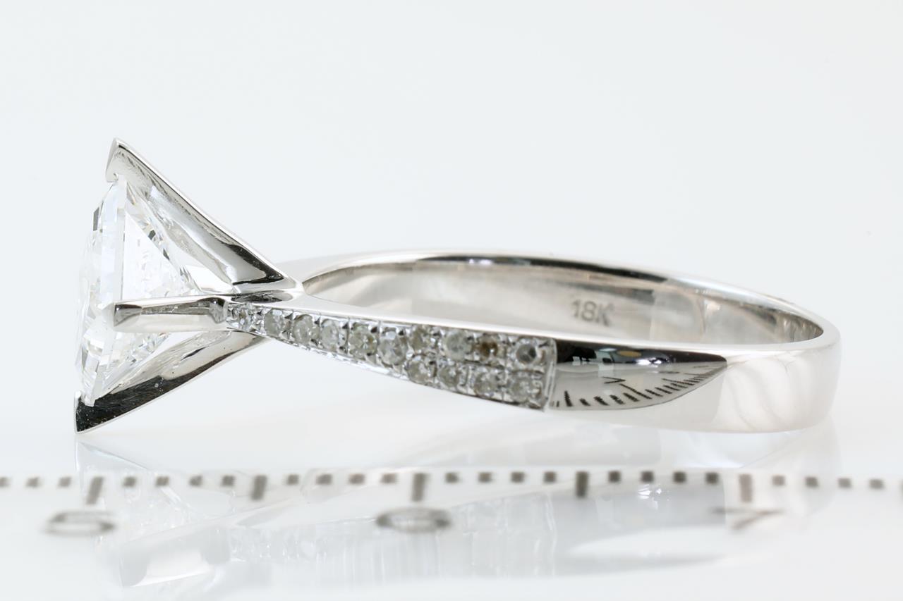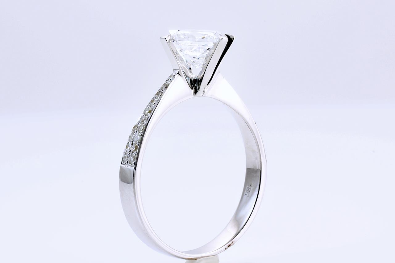 Diamond ring with a centre princess cut Diamond of 1.01ct (With GIA report graded as E VVS2 #15703516) and shoulder Diamonds totalling approximately 0.10cts. 18ct white gold. Ring size L. Weight: 2.5g (Pre-owned)