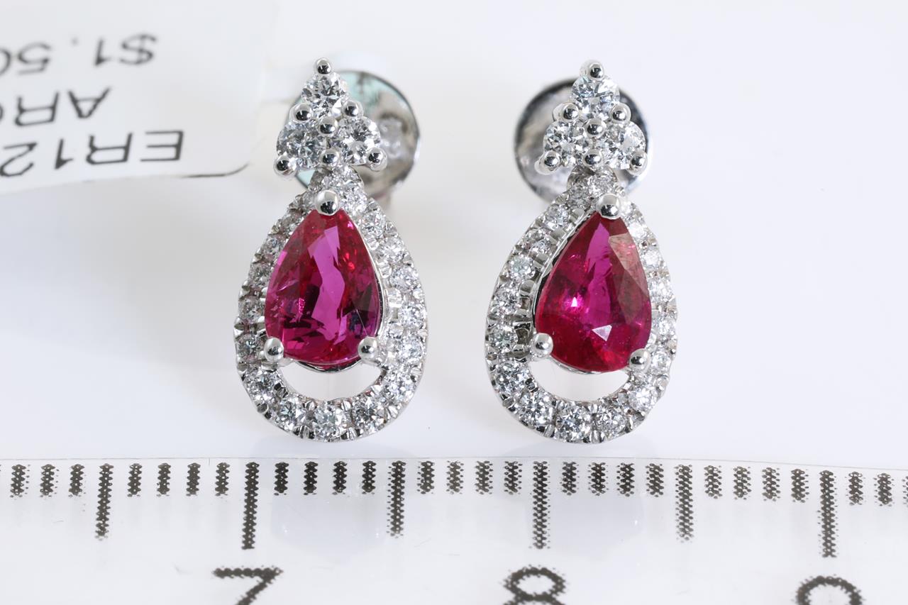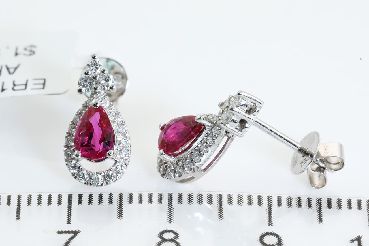 Ruby and Diamond earrings with pear shape Rubies totalling 1.01cts and Diamonds totalling 0.29cts. 18ct white gold. Weight: 2.3g. (As new)