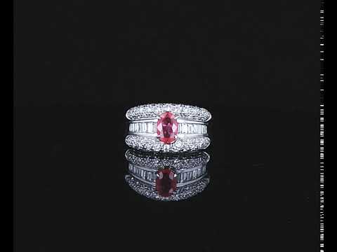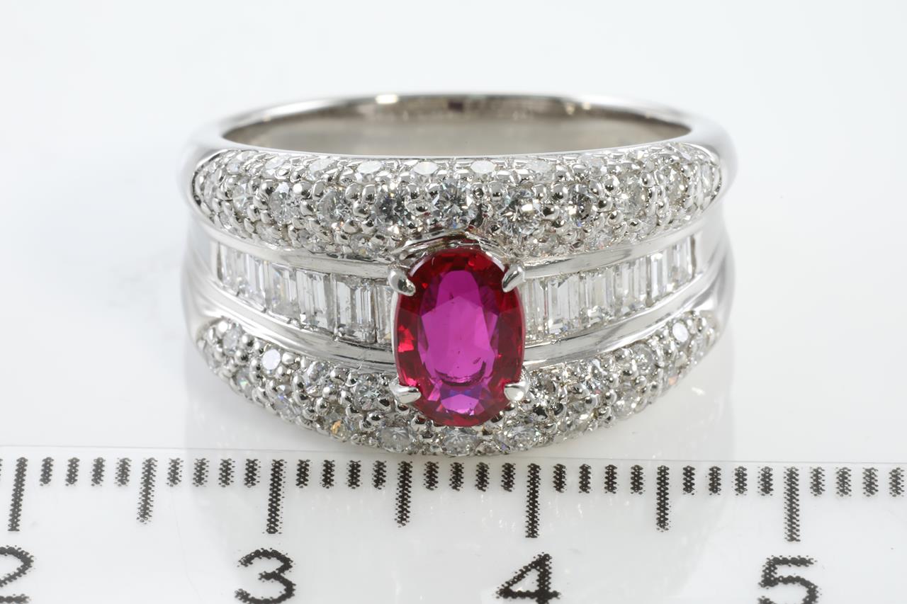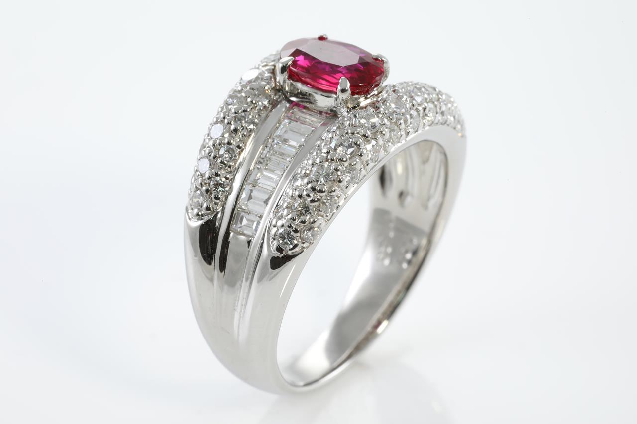 Ruby and Diamond ring with oval shape unheated Ruby of 1.01ct (with GIA report #7311623814) and round & baguette cut Diamonds totalling 1.43cts (Estimated grading: G-H VS-SI). Platinum. Ring size P½ - Note this ring cannot be resized. Weight: 13.6g (Pre-owned)
