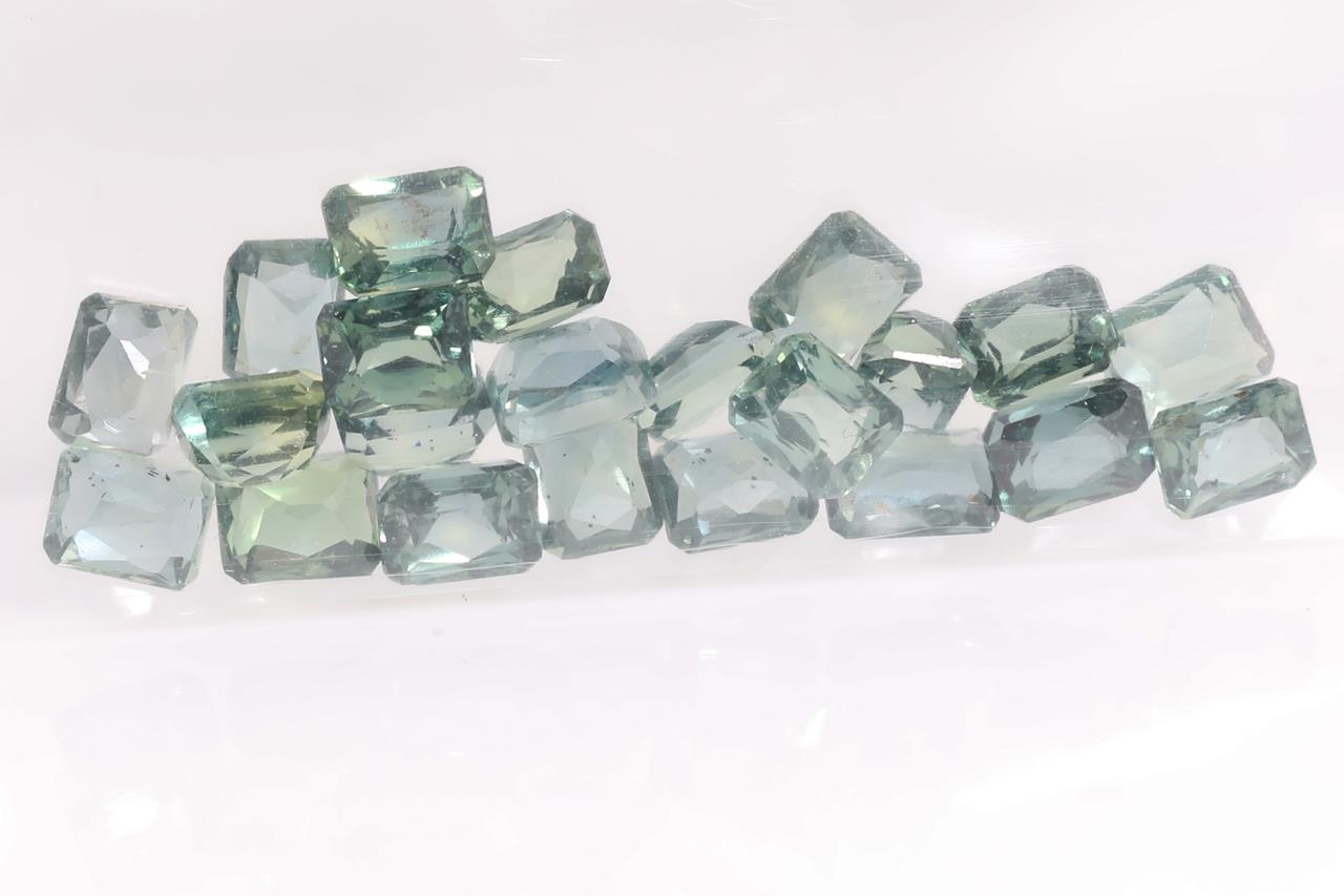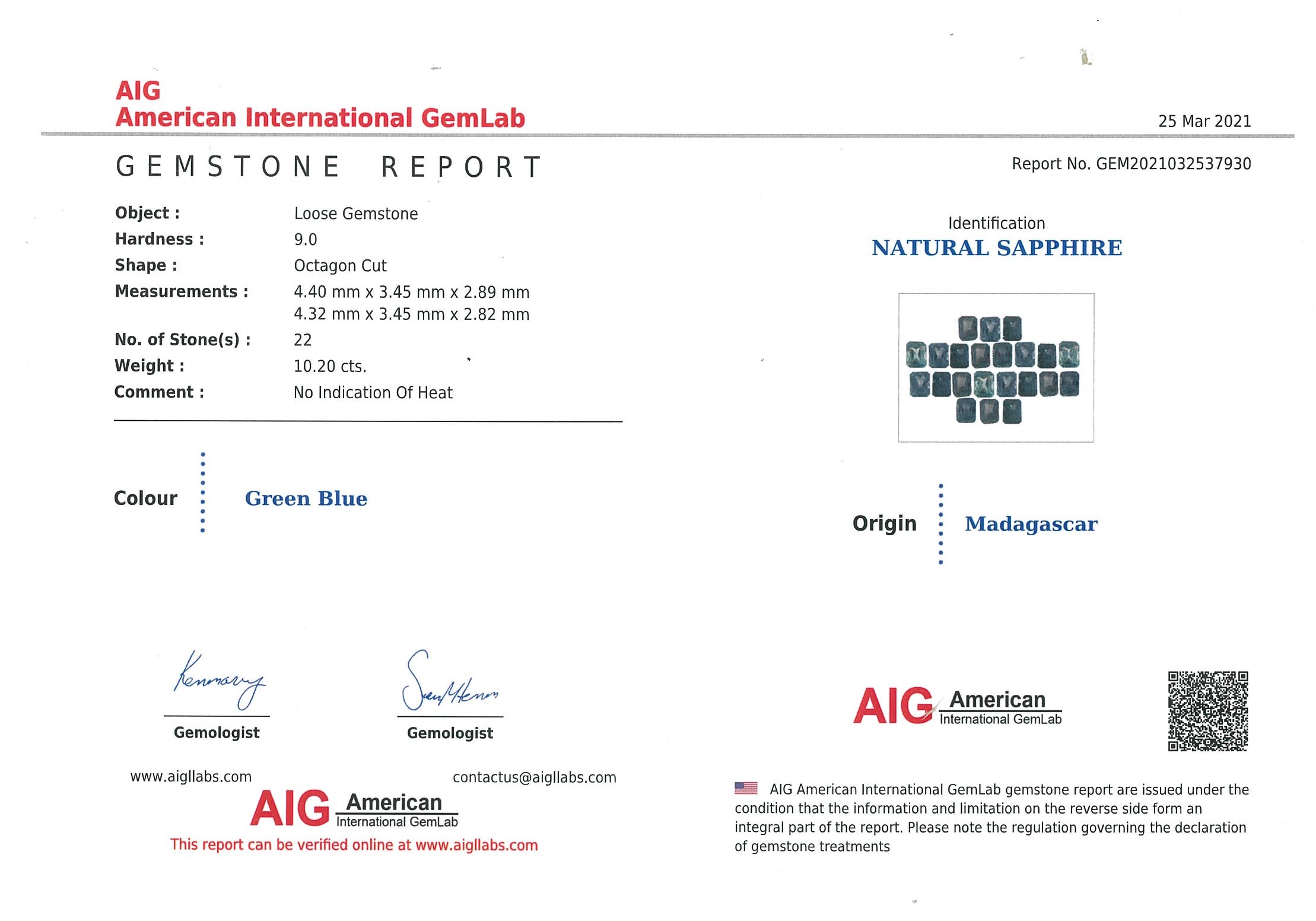 A loose parcel of 22 green blue unheated radiant (octagon) cut Sapphires totalling 10.20cts. Origin: Madagascar. With AIG report dated 25/03/2021. (As new)