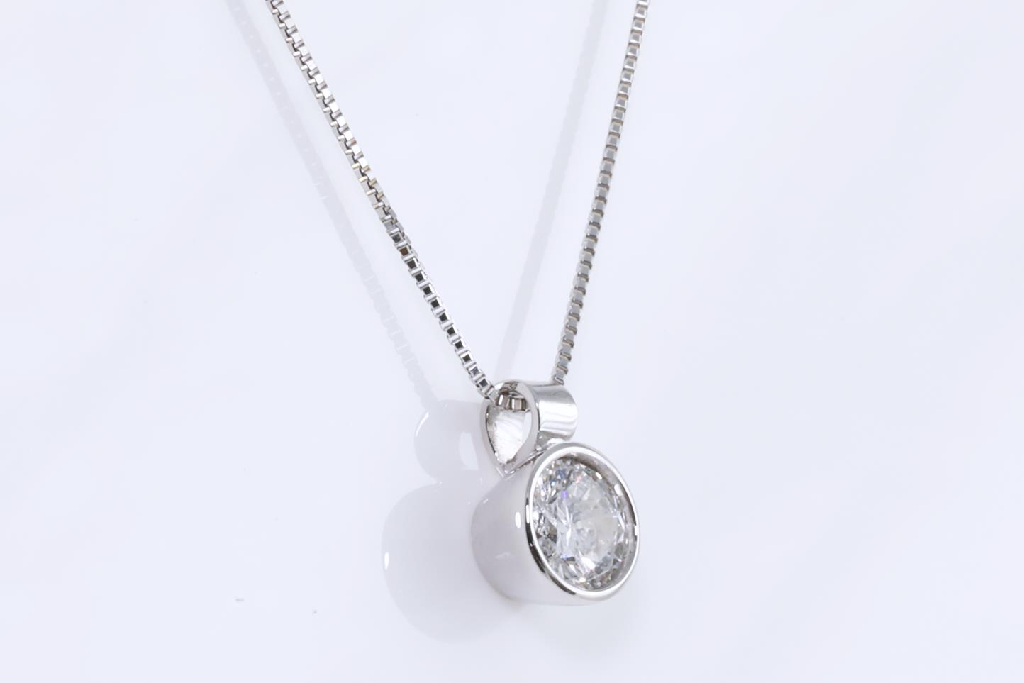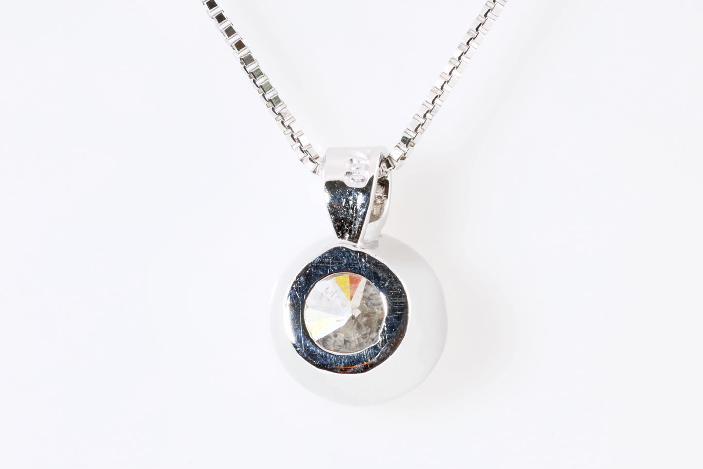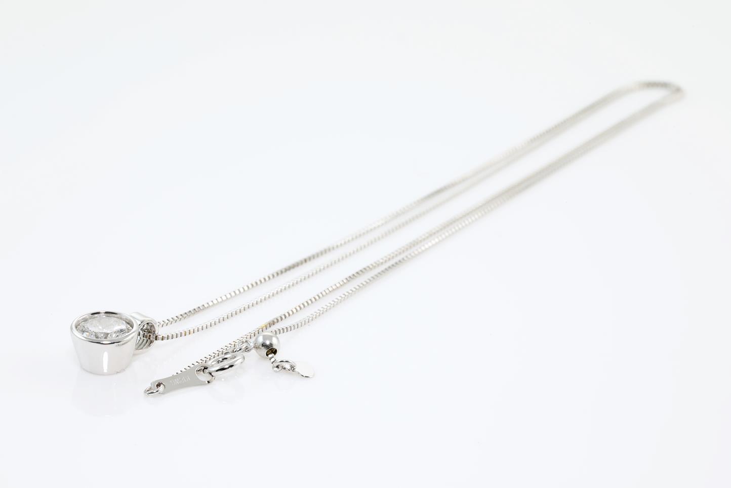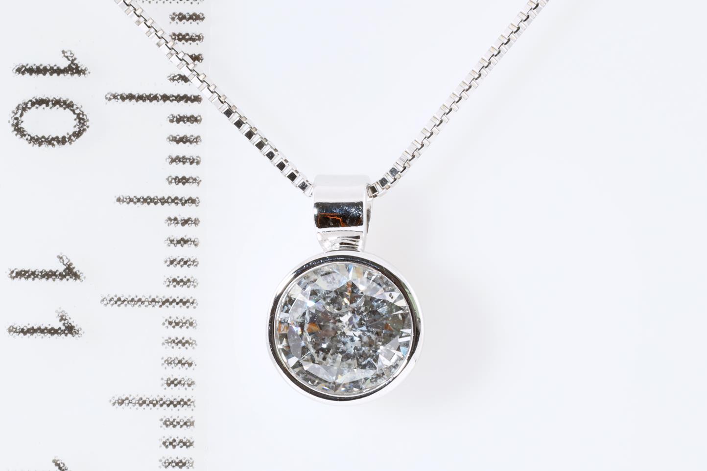 Diamond pendant with round brilliant cut Diamond of 1.02ct (grading as: G P3 with GSL memo #GSL011220-1). 18ct white gold with 45cm ajustable 18ct white gold chain. Weight: 3.6g (New)