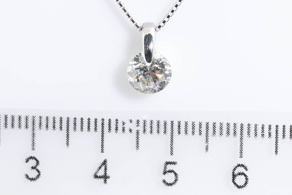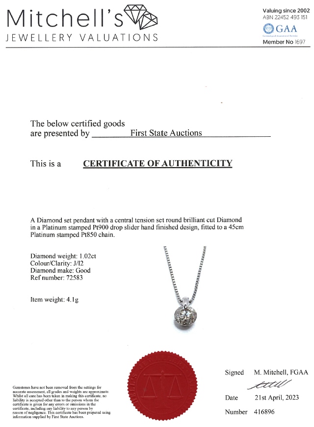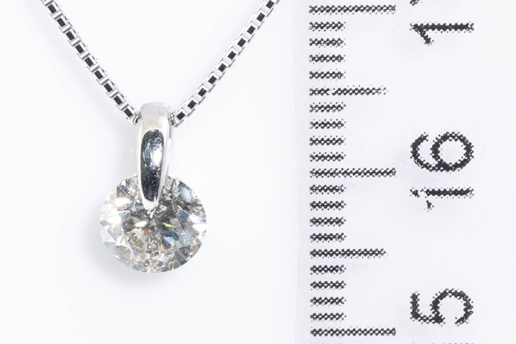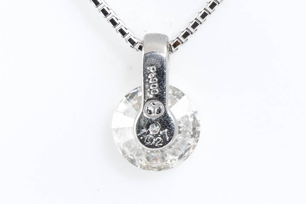 Diamond solitaire pendant with round brilliant cut Diamond of 1.02ct (Estimated grading: J P2). Platinum with 45cm platinum adjustable chain. With Certificate #416896. Weight: 4.1g. (Pre-owned)