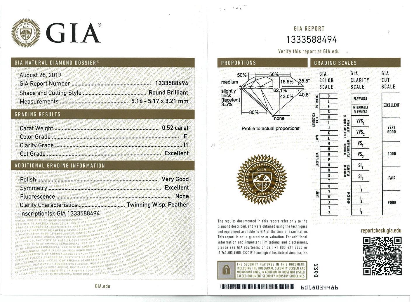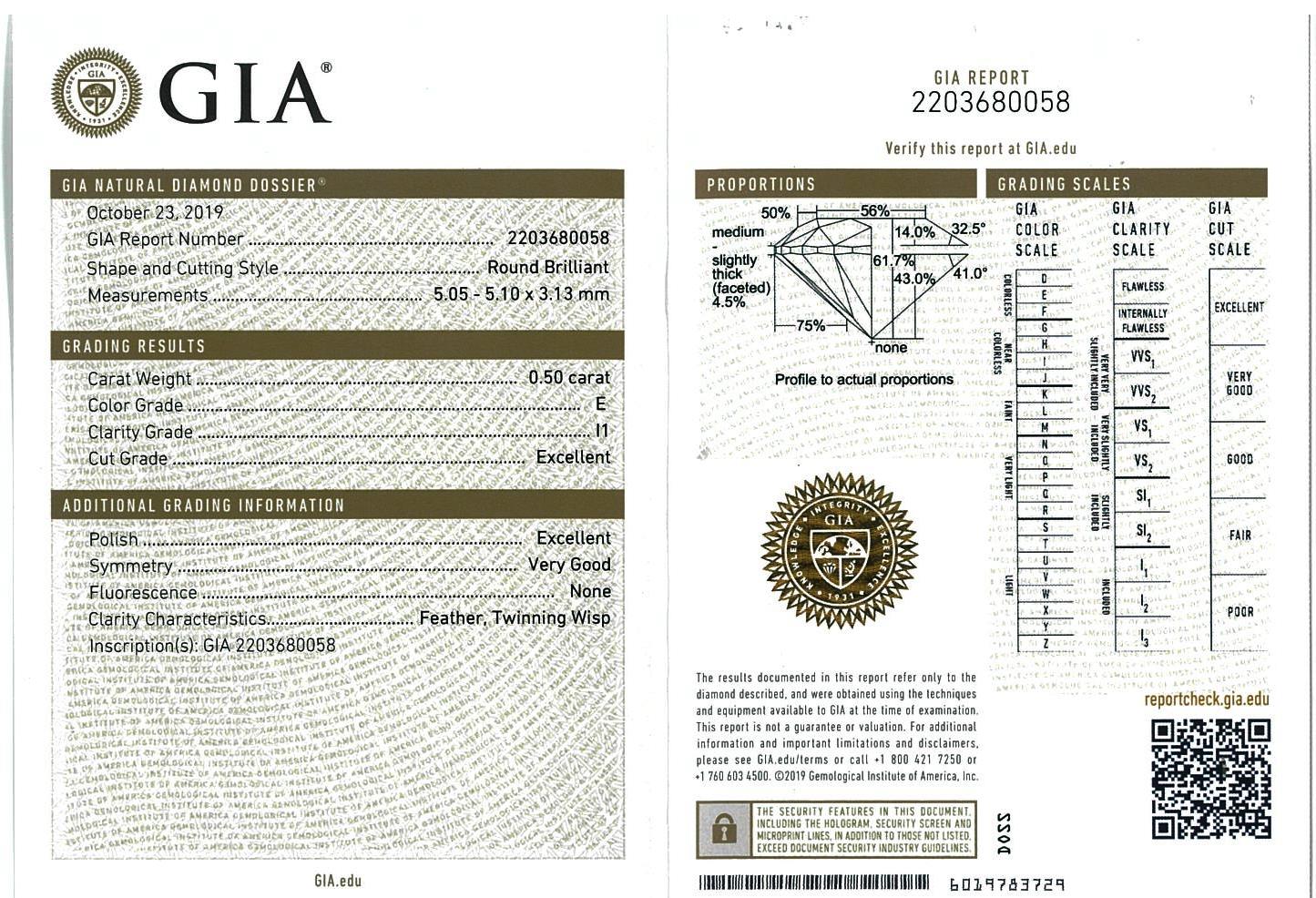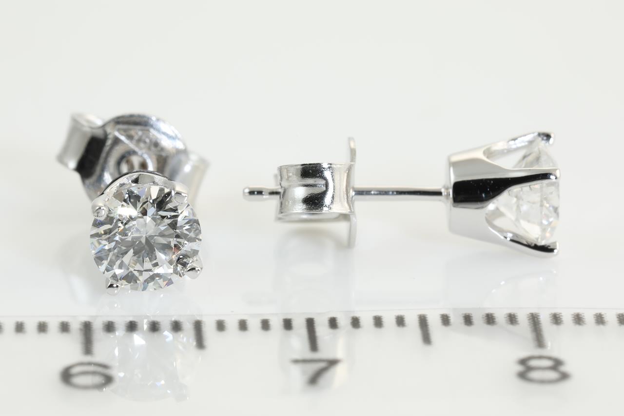 Diamond stud earrings with 2 round brilliant cut Diamonds totalling 1.02cts (with GIA reports graded as E P1 #2203680058,1333588494). 18ct white gold. Weight: 1.6g. (New).
