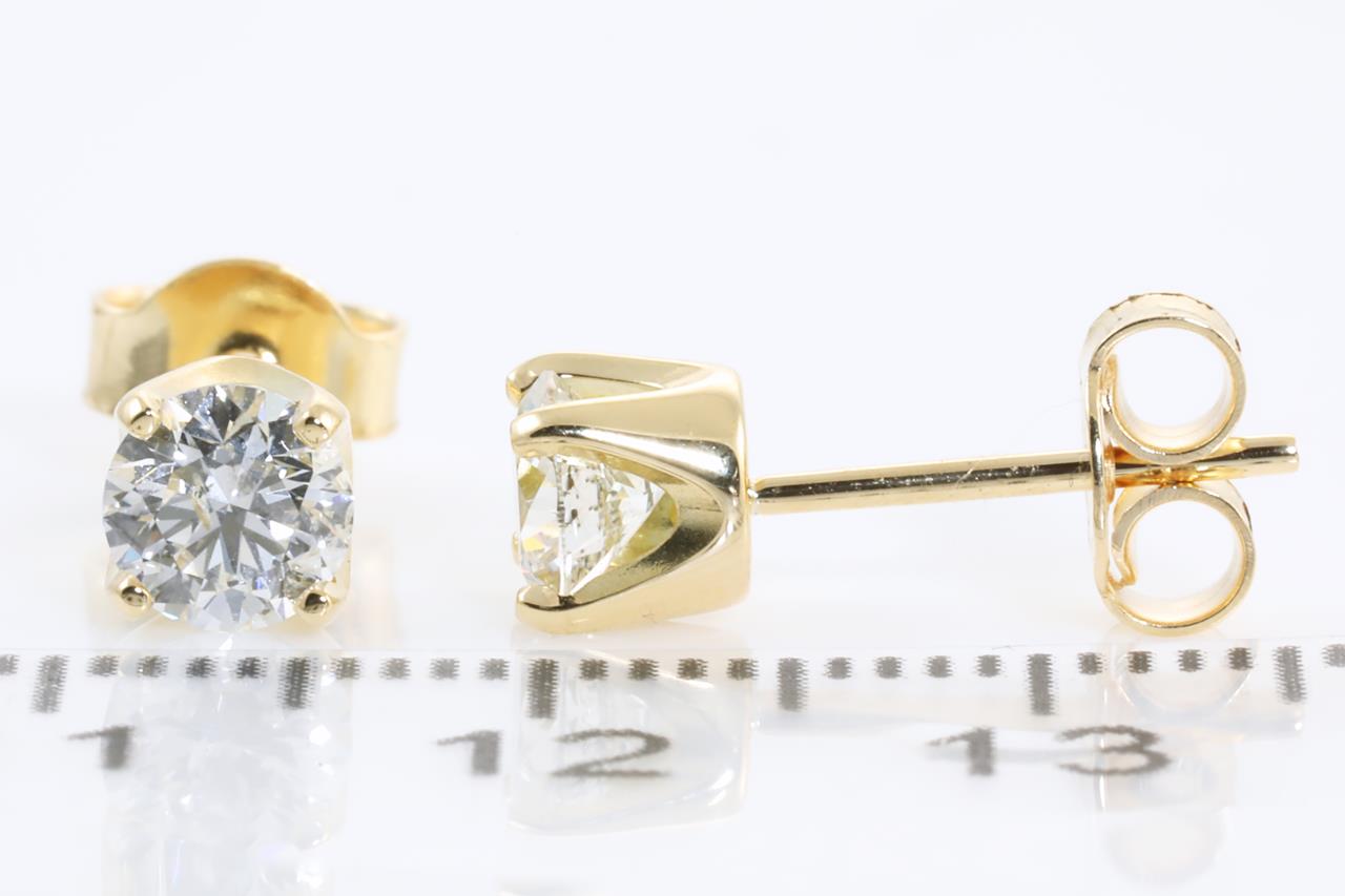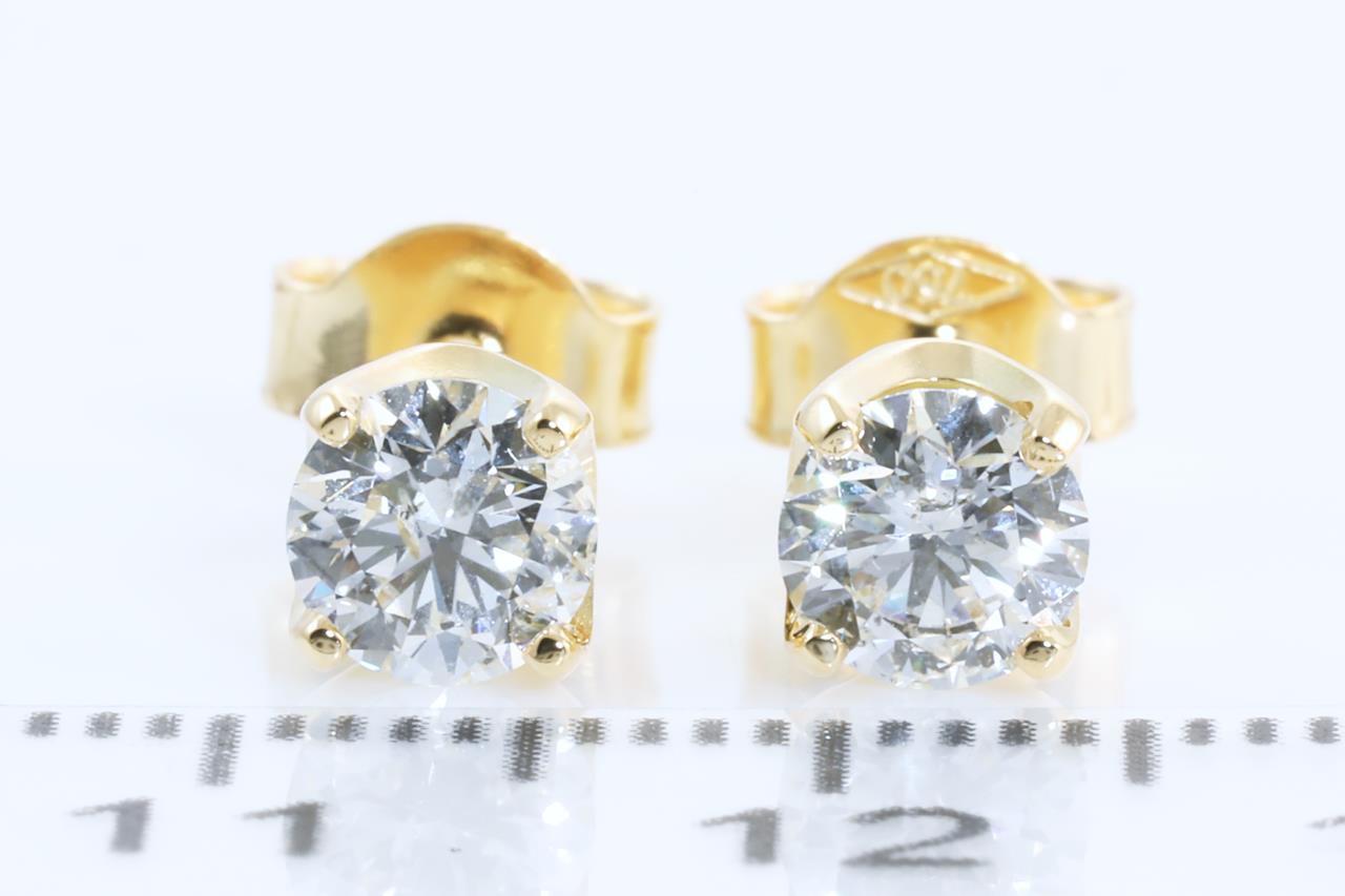 Diamond stud earrings with 2 round brilliant cut Diamonds totalling 1.02cts (with GIA reports graded as H P1-2 #6352229844, 6305339674). 18ct yellow gold. Weight: 1.9g. (New).