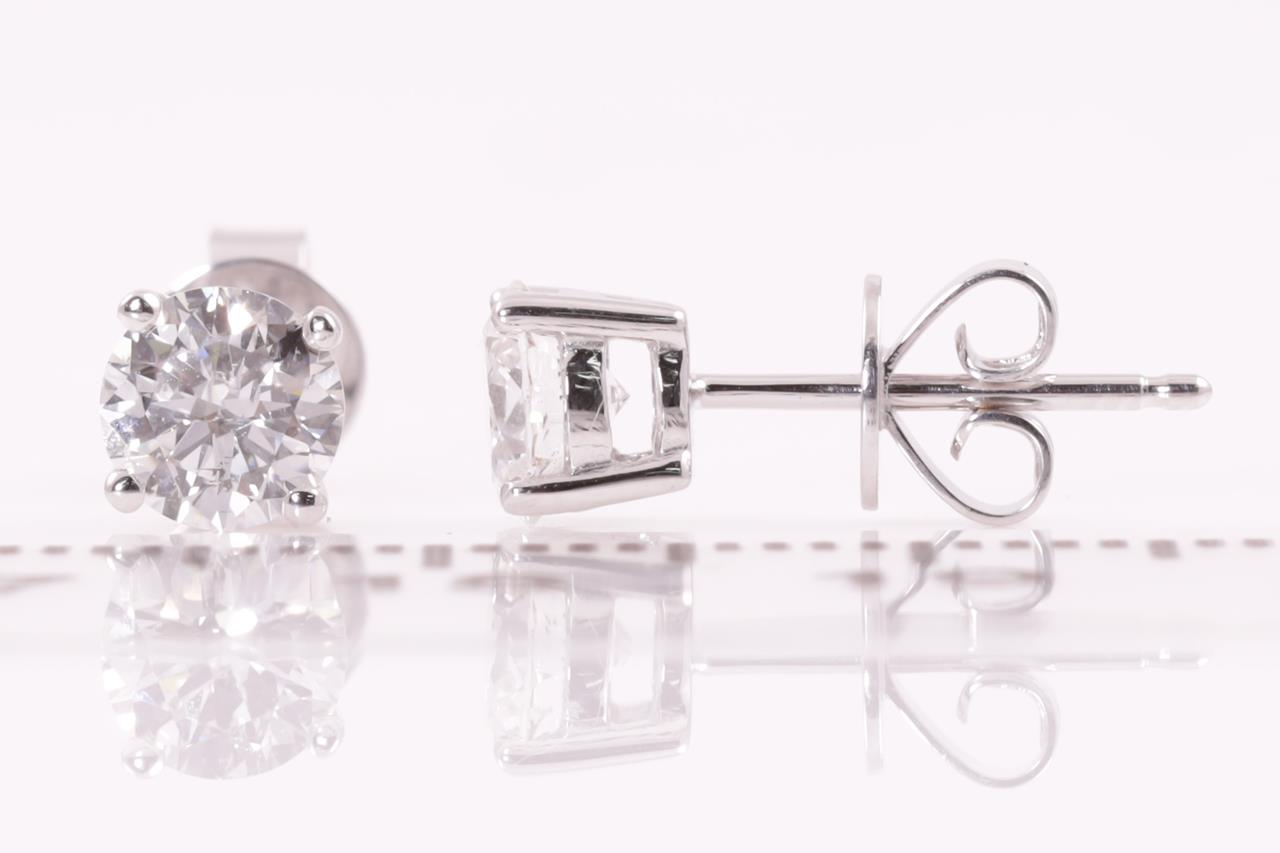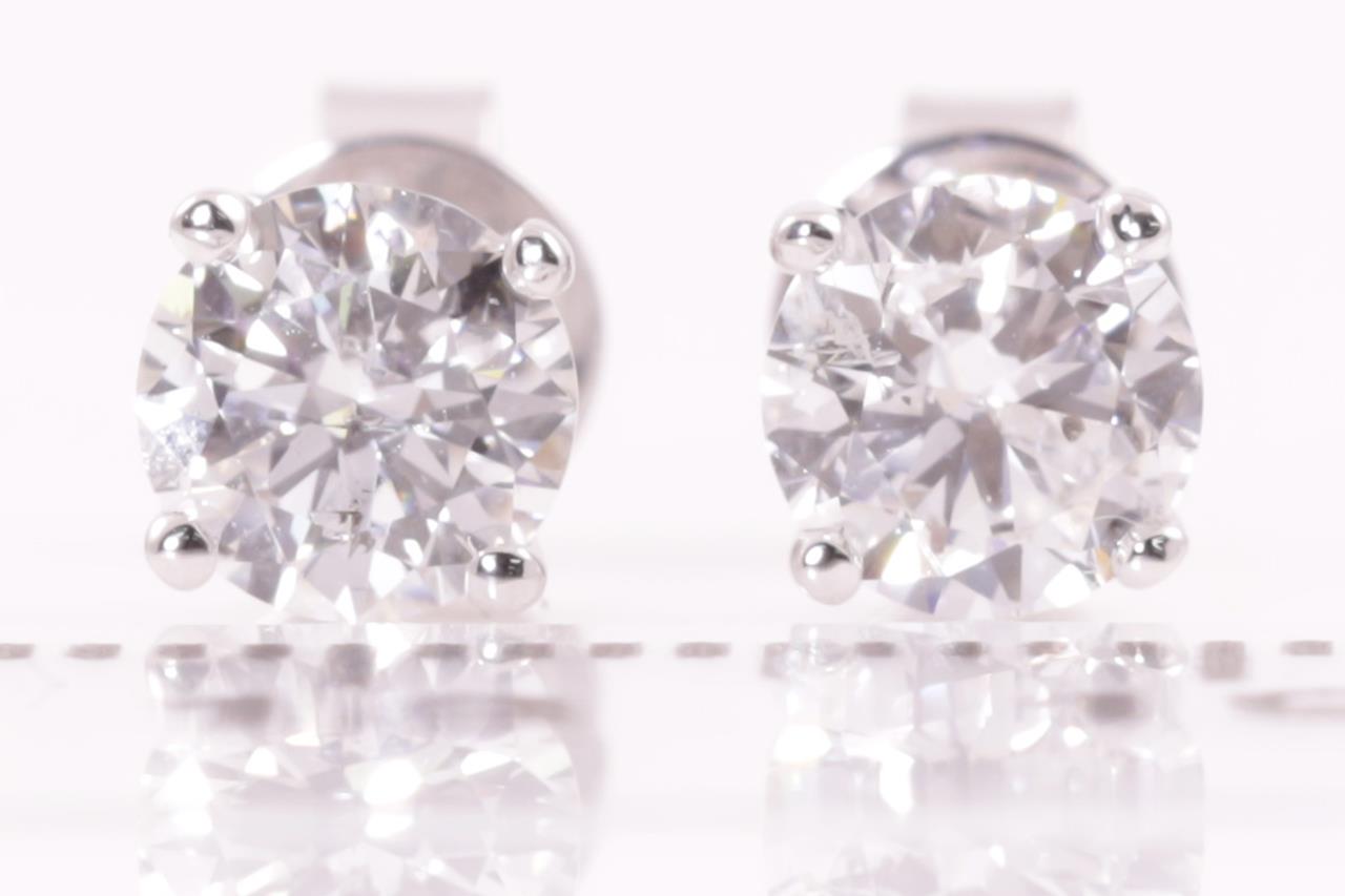 Diamond stud earrings with 2 round brilliant cut Diamonds totalling 1.02cts (Estimated grading: G SI2). 18ct white gold. Weight: 1.5g. With certificate #414942. (New).